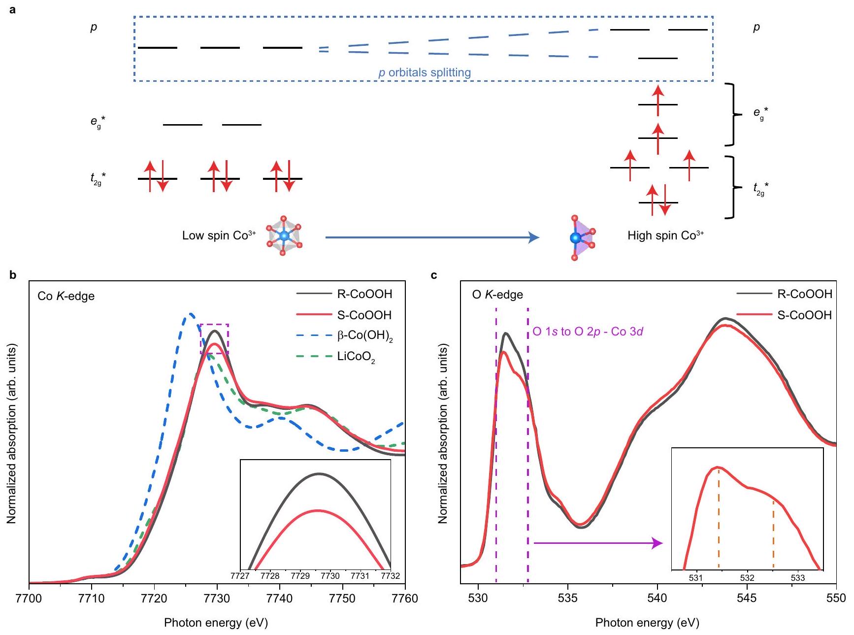 الفلزية. كما هو موضح في الشكل التكميلي S17، لوحظ انزياح أحمر صغير قدره 0.47 إلكترون فولت في طاقة الفوتون (مشار إليه بسهم بنفسجي) في S-CoOOH، مما يشير إلى حالة فلزية كوبالت أقل قليلاً من تلك الموجودة في R-CoOOH. يجب ملاحظة أن تغيير حالة الفلزية لكوبالت الناتج عن تغطية الهيدروجين وحالة الدوران يمكن أن ينظم