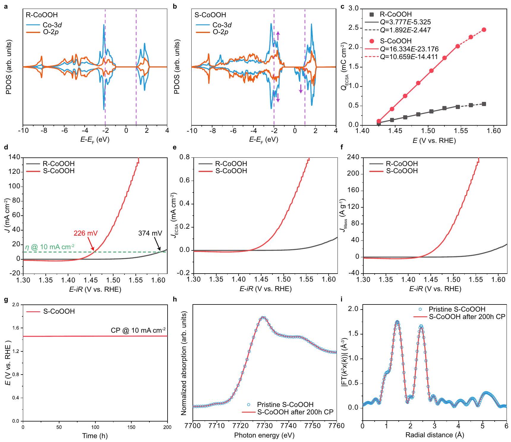 الجهد الزائد لـ S-CoOOH المعدل على المساحة السطحية الكهروكيميائية (ECSA) هو أقل بكثير من ذلك لـ R-CoOOH (الشكل 5e). كما تظهر نتائج متسقة في النتائج من حيث كثافة التيار المعدلة على الكتلة المحملة (الشكل 5f). البيانات الكهروكيميائية الخام بدون