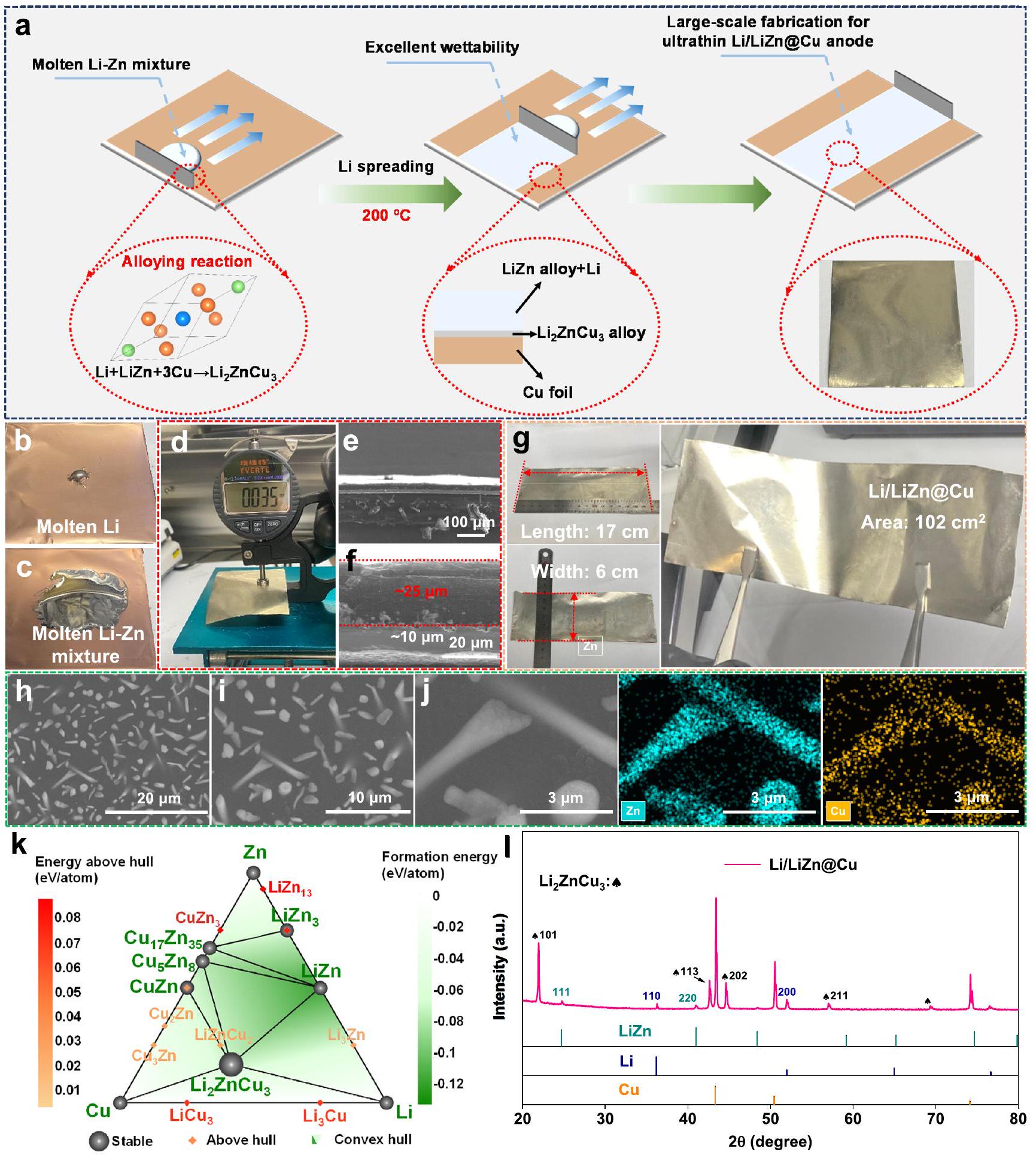 images, corresponding EDS mappings of the thin Li/LiZn@Cu anode. k The calculated ternary phase diagram of the system at 473 K . 1 XRD pattern of the thin Li/LiZn@Cu anode.