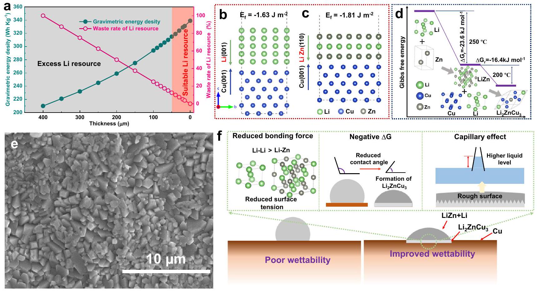 في الذي و تشير إلى زاوية الاتصال بعد أو قبل التفاعل، هو تغيير في طاقة الواجهة بين الصلب والسائل نتيجة التفاعل، وهي طاقة الواجهة بين الغاز والسائل. كلما كانت أصغركلما كانت القابلية للرطوبة أفضل. وبالتالي، فإن السبائك الطاردة للحرارة (السلبية ) من و يمكن أن يقلل منلزيادة قابلية wettability لليثيوم على رقائق النحاس، مما يوفر قوة دافعة إضافية لانتشار الليثيوم المنصهر، بما يتماشى مع التقارير السابقة. بشكل أكثر أهمية، تشكيل يمكن أن تحول السبيكة شكل ورقة النحاس وتُحسن بشكل كبير من خشونتها كما هو موضح في الشكل 2e. الاتصال بين المنصهريمكن أن تكون الخلطة وركيزة النحاس يعتبر حالة وينزل بسبب الواجهة المضغوطة داخل طبقة Li / LiZn و Cu في، مما يمكن أن يحسن من قابلية بلل السطح المحب لليثيوم من خلال زيادة الخشونةمثل هذه الشكل الهرمي لـالسبيكة تظهر الهياكل النانوية الوفيرة لتشكيل تأثير الشعيرات الدموية الفعال، والذي يساهم أيضًا في قابلية رطوبة الليثيوم بواسطة ضغط لابلاس.; ، حيث هو توتر السطح للليثيوم المنصهر و يشير إلى نصف قطر الشعيرات الدموية)، كما هو موضح في الشكل 2e،تحت التأثيرات التآزرية المذكورة أعلاه، زاوية الاتصال لـبين المنصهرالمزيج وركيزة النحاس أصغر بكثير منبين الليثيوم المنصهر وركيزة النحاس كما هو موضح في الشكل التكميلي 18.