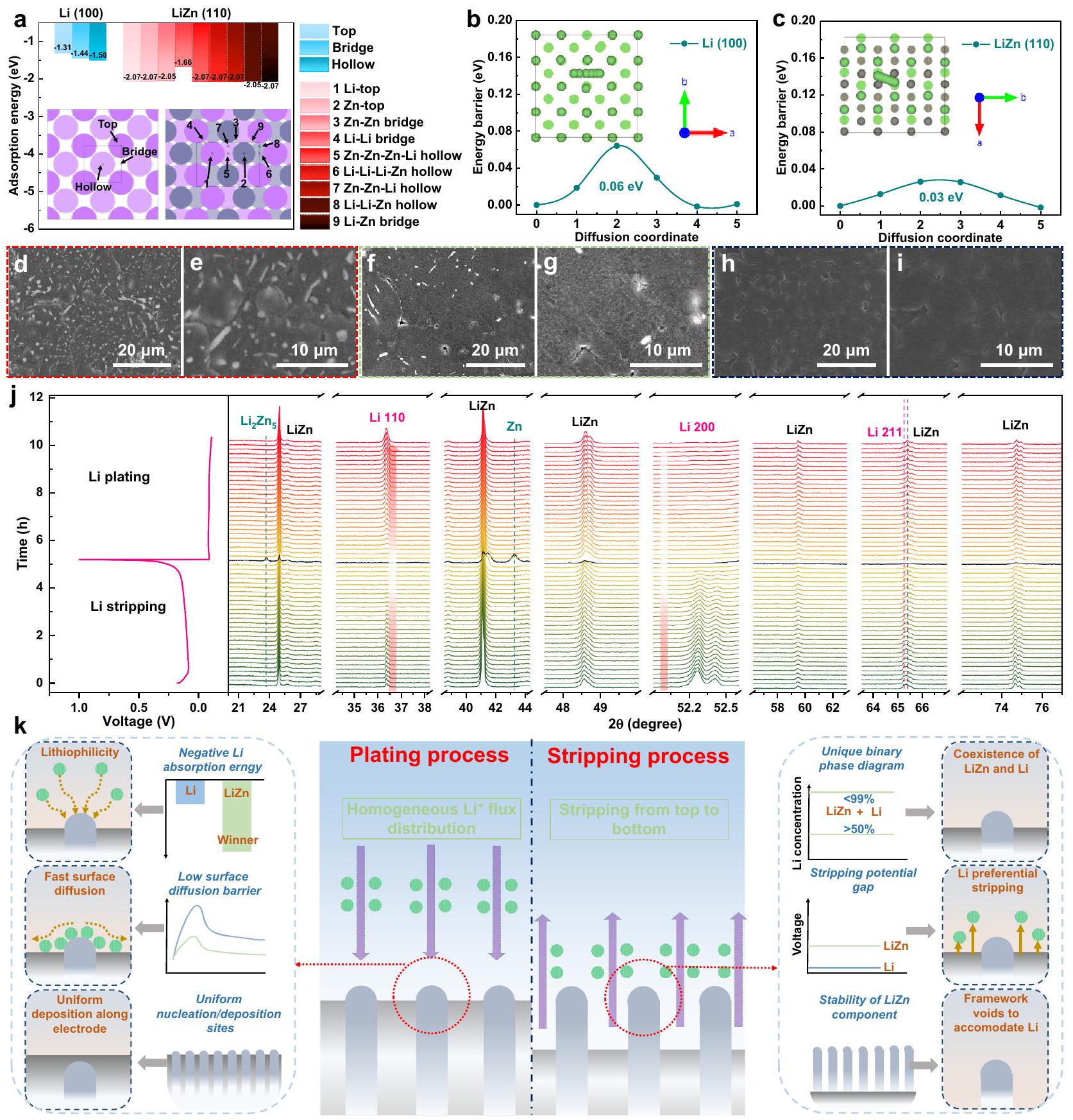 deposition at (d, e) 0.5 , (f, g) 1 , and (h, i) . j In-situ XRD analysis and (k) schematic illustration of the Li stripping and plating processes of the Li / LiZn@Cu anode.