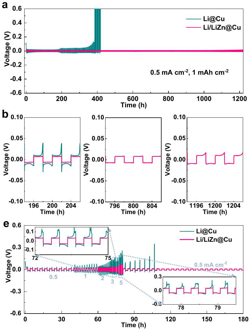 تظهر الشكل 4 الأداء الكهروكيميائي للرقيق و الأنودات باستخدام خلايا متماثلة. السعة المدورة ثابتة عند، مما يتوافق مع تصريف بعمق ، وهو أكبر من ذلك في الأعمال المبلغ عنها كما هو مدرج في الجدول التكميلي 6. كما هو موضح في الشكل 4a، كلا الخليتين تظهران ملفات جهد مستقرة، بينما الفرق الملحوظ هو أن الجهد الزائد لـ Li /أقل من ذلك منالأنودات في الدورات التسعين الأولى في. يمكن أن يُعزى ذلك إلى حاجز أعلى لتكوين/ترسيب الليثيوم على السطح الناتج عن عملية واجهة ضعيفة كما هو موضح في طيف التحليل الكهربائي للمعاوقة (EIS) في الأشكال التكميلية 25 و26 والجدول التكميلية 7، حيث يظهر الشكل الشجيري وغير المتساوي السماكةالأنود لديه حالة غير مستقرة في البدايةواجهة الإلكتروليت مع SEI الأعلى ) وانتقال الشحنة ( مقاومات أكثر من تلك الخاصة بـالأنود. علاوة على ذلك، فإن استقطاب الجهد لـيزداد الأنود عند حوالي 192 ساعة وتحدث فشل الخلية المتماثلة بعد كما هو موضح في الشكل 4a و 4b. على النقيض الحاد، فإن الخلية المتماثلة من أنود Li/LiZn@Cu تقدم أداءً مستقرًا خلال 1200 ساعة استجابةً لعملية الطلاء/الإزالة المتجانسة المذكورة أعلاه وواجهة Li/الإلكتروليت القوية التي تتمتع بها الخصائص الممتازة لجذب الليثيوم، منخفضة حاجز طاقة انتشار الأيونات، ووظيفة شبيهة بالإطار لسبيكة LiZn. حتى عند كثافة تيار أعلى من، الـلا يزال الأنود يقدم أداءً كيميائيًا كهربائيًا مشابهًا دون تقلبات في الجهد على مدى 690 ساعة كما هو موضح في الشكل 4c، d. لاحظ أن هذا الأداء الاستثنائي للرقائقأنودأفضل حتى من رقائق الليثيوم التجارية ) كما هو موضح في الأشكال التكميلية 27، 28.