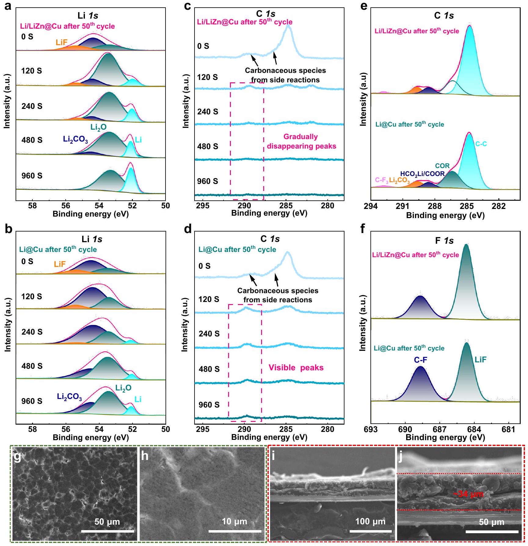 Fig. 5b. While, the content of LiF in is higher than the , probably giving a profitable effect for uniform flux distribution and electron insulation , which is also verified in the spectra of F 1 s as shown in Fig. 5f. Of special interest is that at the etching time of 120 s , a new peak at 52.0 eV is assigned to the metallic Li in , while it does not show up in , which plausibly indicates the thinner SEI growth of Li/LiZn@Cu with respect to that of electrodes. Alongside the etching, the metallic Li appears in both electrodes, but the amount of the parasitic by side reactions is obviously higher in Cu than that in Cu electrodes. Figure 5c-e demonstrates the characteristic C peaks at 284.8 , 286.4, , and 292.8 eV that are identified as the C-C, COR (R: radicals), , and , respectively . Especially,