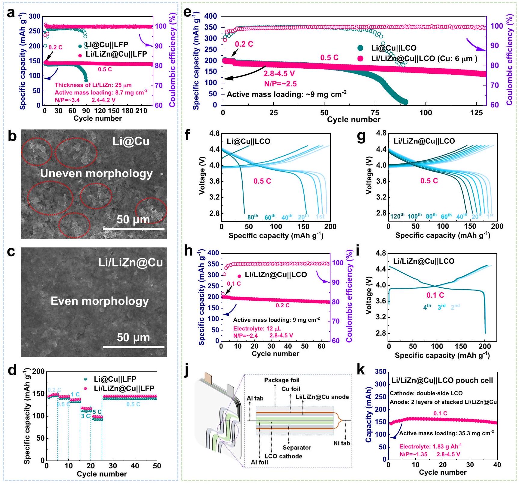 In conclusion, the thin Li/LiZn@Cu anodes with large sizes ( ) and adjustable thicknesses/capacities of , ) are successfully fabricated by a facile and low-cost approach for high-energy-density LIBs. Benefiting from the LiZn alloy, the thin Li/LiZn@Cu anode demonstrates the homogeneous and abundant surface functional sites to intrigue the Li stripping/plating and delivers the hierarchical Li electrochemistry to regulate the dendrite-free morphology and robust Li/electrolyte interface. As expected, the Li/LiZn@Cu anode not only exhibits excellent cycling stability over 1200 h at in the symmetric cell, but also realizes a prolonged lifespan of 230 cycles under a suitable N/P ratio when paired with the LFP cathode. Moreover, a high energy density battery of when containing 10 stacked layers) is obtained in LCO-based pouch cell, consisting of the lean electrolyte ( ), low N/P ratio ( 1.35 ), thinner Cu foilbased Li/LiZn@Cu anode, and double-sided LCO cathode . Such a promising alloy-type technology for thin Li metal anodes sheds a practicable and up-and-coming routine for future high-performance and high-energy-density Li metal batteries.