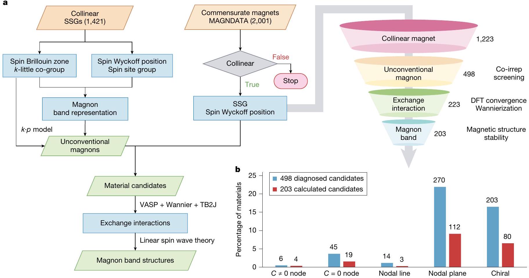 الشكل 2 | سير العمل لبناء قاعدة بيانات المغنطيسات غير التقليدية. أ، أولاً، تم تحديد 1,223 مغناطيس متوازي من قاعدة بيانات MAGNDATA. ثانياً، بعد تحديد SSG، تم إجراء فحوصات التماثل المشترك للحصول على مرشحات المواد التي تستضيف المغنطيسات غير التقليدية. ثالثاً، تم إجراء حسابات عالية الإنتاجية للحصول على جميع تفاعلات التبادل الثنائي. أخيراً، تم بناء قاعدة بيانات المغنطيسات غير التقليدية مع 203 هيكل نطاق مغنطيسي وتم تحديد تمثيلات النطاق. إحصائيات خمسة أنواع من الماجنون غير التقليدي في المغناطيسات الخطية من قاعدة بيانات MAGNDATA، بما في ذلك: (1) الكواريز الجزيئية الحلزونية )، بما في ذلك C-4 ثماني، C-4 سداسي، C-8 ديراك و C-2 ثلاثي ماغنون؛ (2) شحنة طوبولوجية محايدة ( ) الكوارتزات، بما في ذلك الدوديكوبل، الأوكتوبل، السكسوبل والتريبل ماغنون؛ (3) ماغنونات خط العقدة الأوكتوبل؛ (4) ماغنونات مستوى العقدة الرباعية؛ و (5) ماغنونات شيرال الانقسام المغناطيسي البديل.