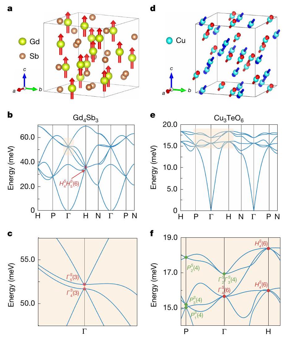 الشكل 3 | مرشحات المواد التي تستضيف المغنون غير التقليديين. أ-ج، الهيكل المغناطيسي (أ)، هيكل نطاق المغنون (ب) مع عرض مكبر (ج) للترتيب المتوازيالتي تحتوي على تقاطعات نطاقات بستة وأربعة وثلاثة أضعاف.نفس الشيء كمالكن بالنسبة للتوازيمع تقاطع حزام مكون من 6 طيات عند و نقاط.نفس الشيء كما، ولكن بالنسبة للألترمغناطيس FeS، الذي لديه انحلال ثماني عند نقطة A وانقسام في لولبية المغون على طول