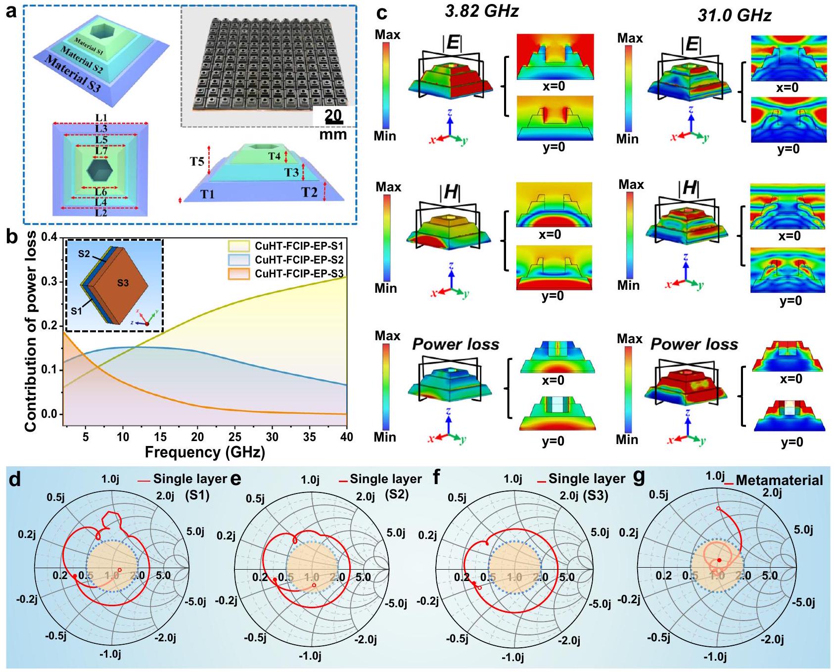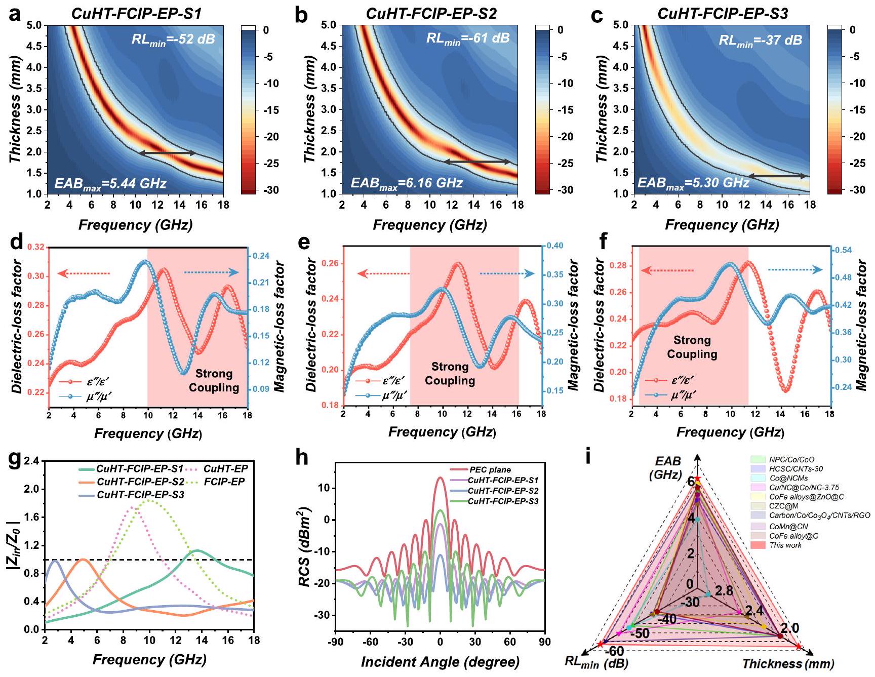 الرسم البياني)، وبالتالي تحقيق امتصاص مثالي. كما هو موضح في الشكل 4د-ز، تؤدي هذه الظواهر إلى تطابق مقاومة قريب من المثالي لمادة CuHT-FCIP-EP الميتامادية، وهو ما لا يمكن تحقيقه بواسطة المواد الميتامادية ذات المكون الواحد. لذلك، يسمح التصميم الهيكلي العقلاني للماص أن يظهر استجابة كهرومغناطيسية قريبة من المثالية، ولكنه يمتلك أيضًا آليات فقد متعددة، مما يعزز من قدرته على امتصاص الموجات الكهرومغناطيسية.