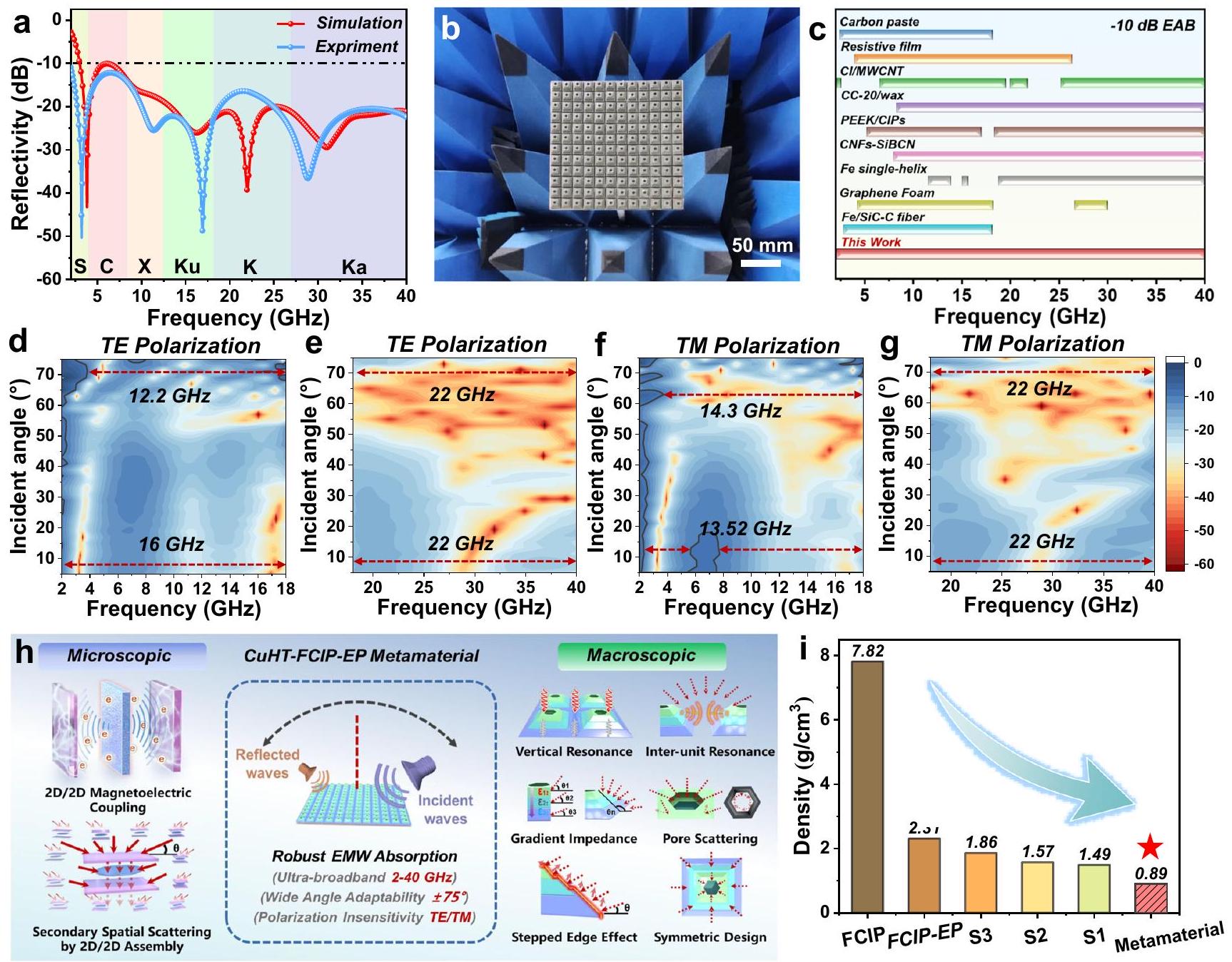 يجمع التصميم بين الهياكل الماكروسكوبية وتصميمات المواد الميكروسكوبية إمكانيات هائلة لتطوير ماصات الموجات الكهرومغناطيسية المتقدمة. هنا، نقترح تصميم مادة ميتا لمعالجة التحديات المستمرة في هذا المجال، بما في ذلك عرض النطاق الضيق، والعقبات في الترددات المنخفضة، وخاصة القضية الملحة للمتانة (أي، الحوادث المائلة والمستقطبة). يتميز ماصنا بإطار معدني عضوي شبه موصل/تجميع ثنائي الأبعاد من الحديد (CuHT-FCIP) مع وفرة من التوصيلات غير المتجانسة البلورية/البلورية وشبكات قوية من الاقتران المغناطيسي الكهربائي. يحقق هذا التصميم امتصاصًا ملحوظًا للموجات الكهرومغناطيسية عبر نطاق واسع (من 2 إلى 40 جيجاهرتز) بسماكة تبلغ 9.3 مم فقط. ومن الجدير بالذكر أنه يحافظ على أداء مستقر ضد الحوادث المائلة (ضمن