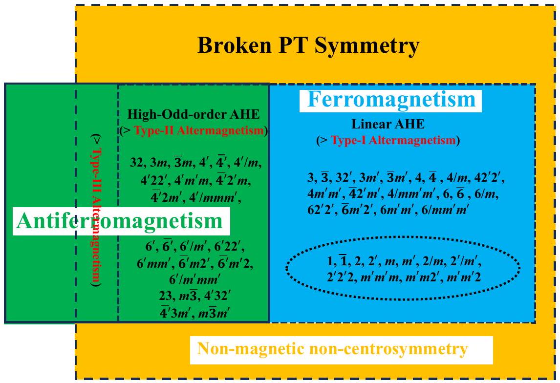 relevant phenomena such as diagonal odd-order current-induced magnetization, off-diagonal odd-order current-induced magnetization, even-order AHE, etc. One example of type-III altermagnets is shown in Fig. 3j (MPG mmm), which has broken PT symmetry but does not exhibit any of the phenomena listed above, at least, along any principal