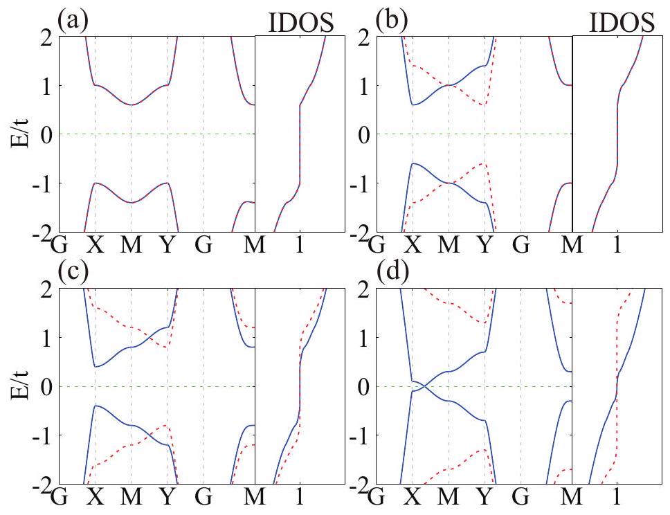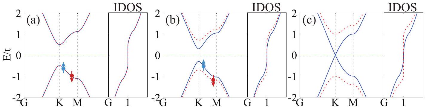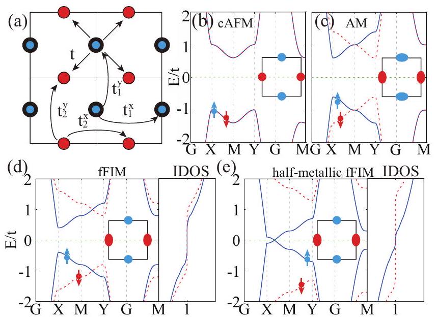 (2) Staggered potential: By applying a staggered potential, introduced by an electric field or substrate, etc., to two magnetic sublattices, the symmetry connecting the two sublattices is broken, leading to spin splitting, and the system becomes a fFIM. From the above theoretical analysis, it can be seen that while a small staggered potential can induce gapped fFIMs, a large one can induce half-metallic fFIMs, as shown in Figs. 2(d) and (e). For example, in experimentally-prepared A-type antiferromagnetic bilayer