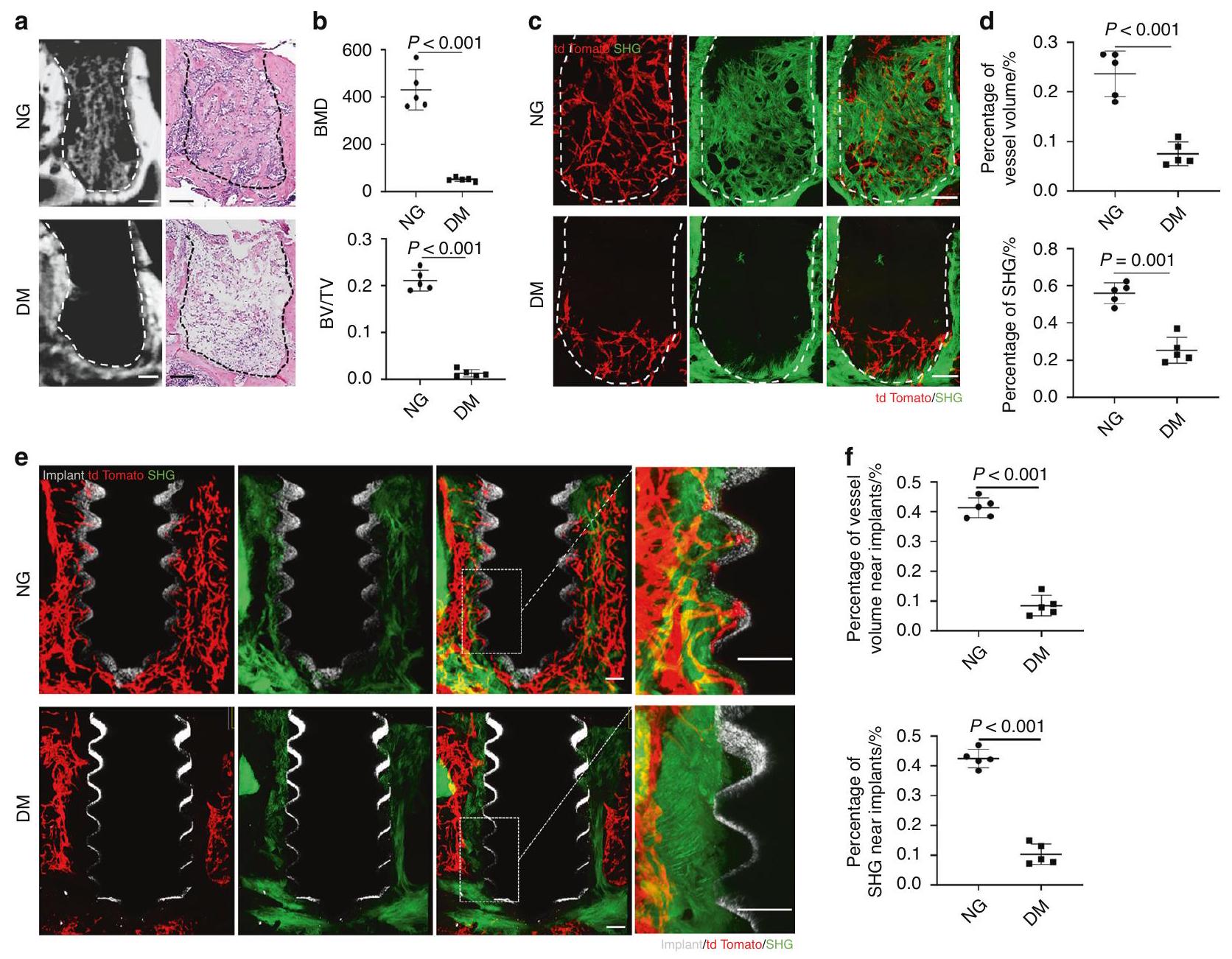 لكشف تأثير السكري على شفاء العظام الفكية، أنشأنا نموذج فئران سكري عن طريق حقن STZ واستخرجنا الأضراس السفلية الأولى. أظهر تحليل Micro-CT أن الفئران DM كانت لديها انخفاض كبير في تكوين العظام مقارنة بالفئران NG. أكدت صبغة H&E للعظام الفكية المنزوعة الكالسيوم الشكل النسيجي للفراغات الفارغة في الفئران DM مقارنة بتكوين العظام الواضح في الفئران NG (الشكل 1أ، ب).