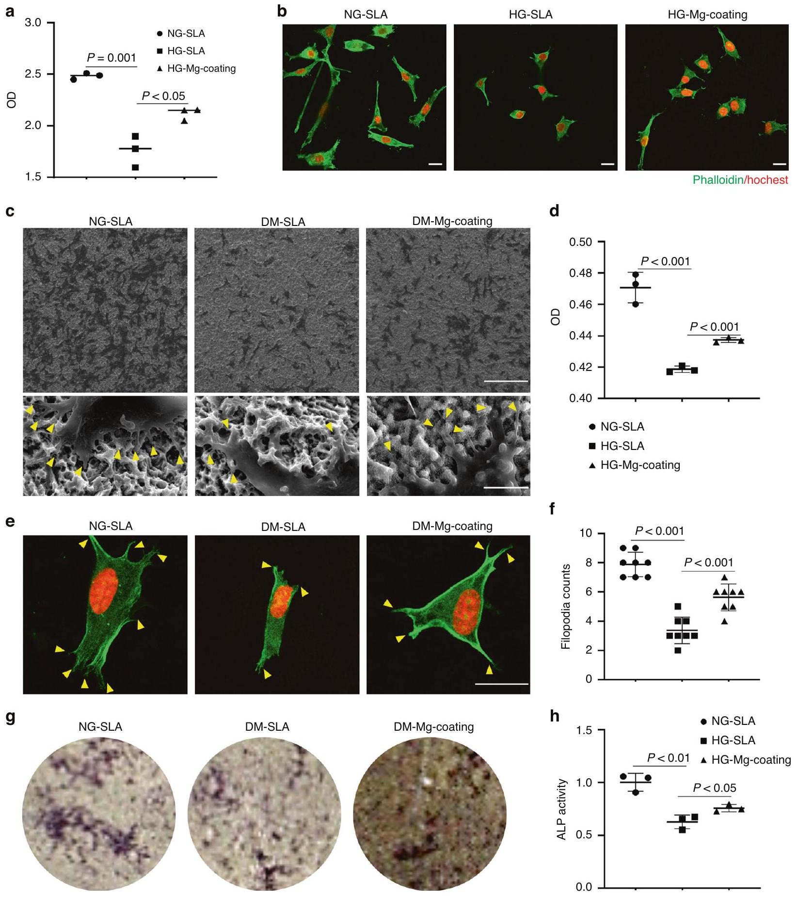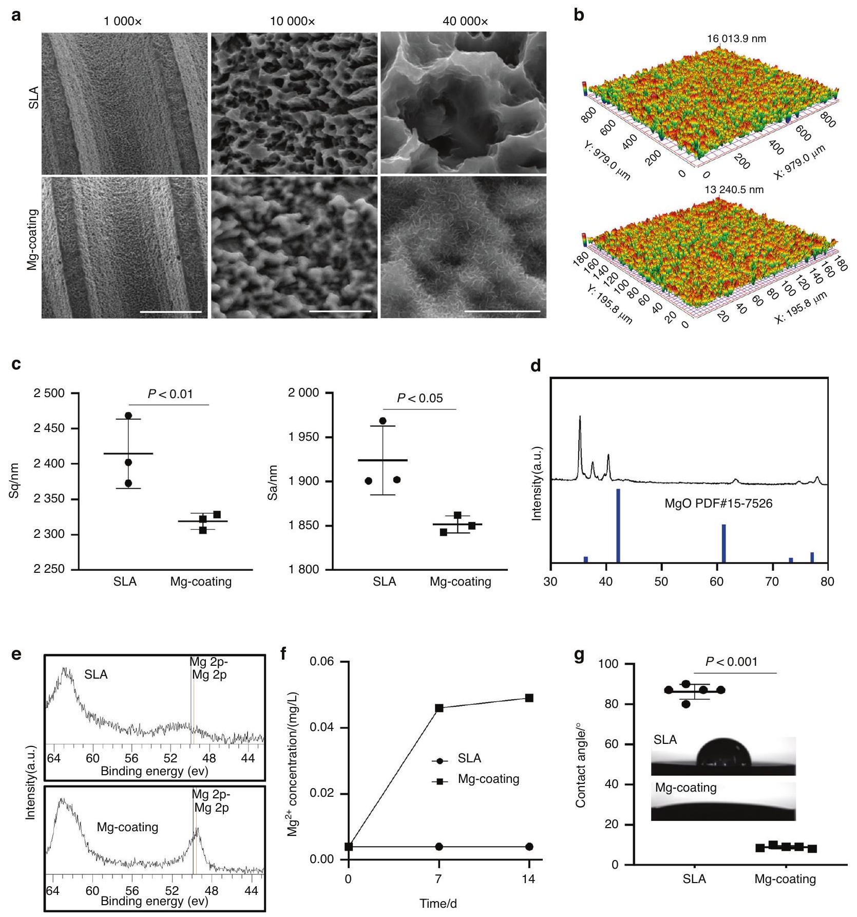 بعد ذلك، قمنا بتطوير زراعة وأوراق مغطاة بمادة المغنيسيوم من خلال التخليق الهيدروحراري. أظهرت مسح SEM أن الطلاء احتفظ بهيكل البناء الملولب للزراعة بينما تم ترسيب أملاح غير عضوية متجانسة على سطح الزراعة في هيكل يشبه النانو، لكنها لم تسد مسام سطح الزراعة SLA تحت تكبير أعلى (الشكل 3أ). السطح