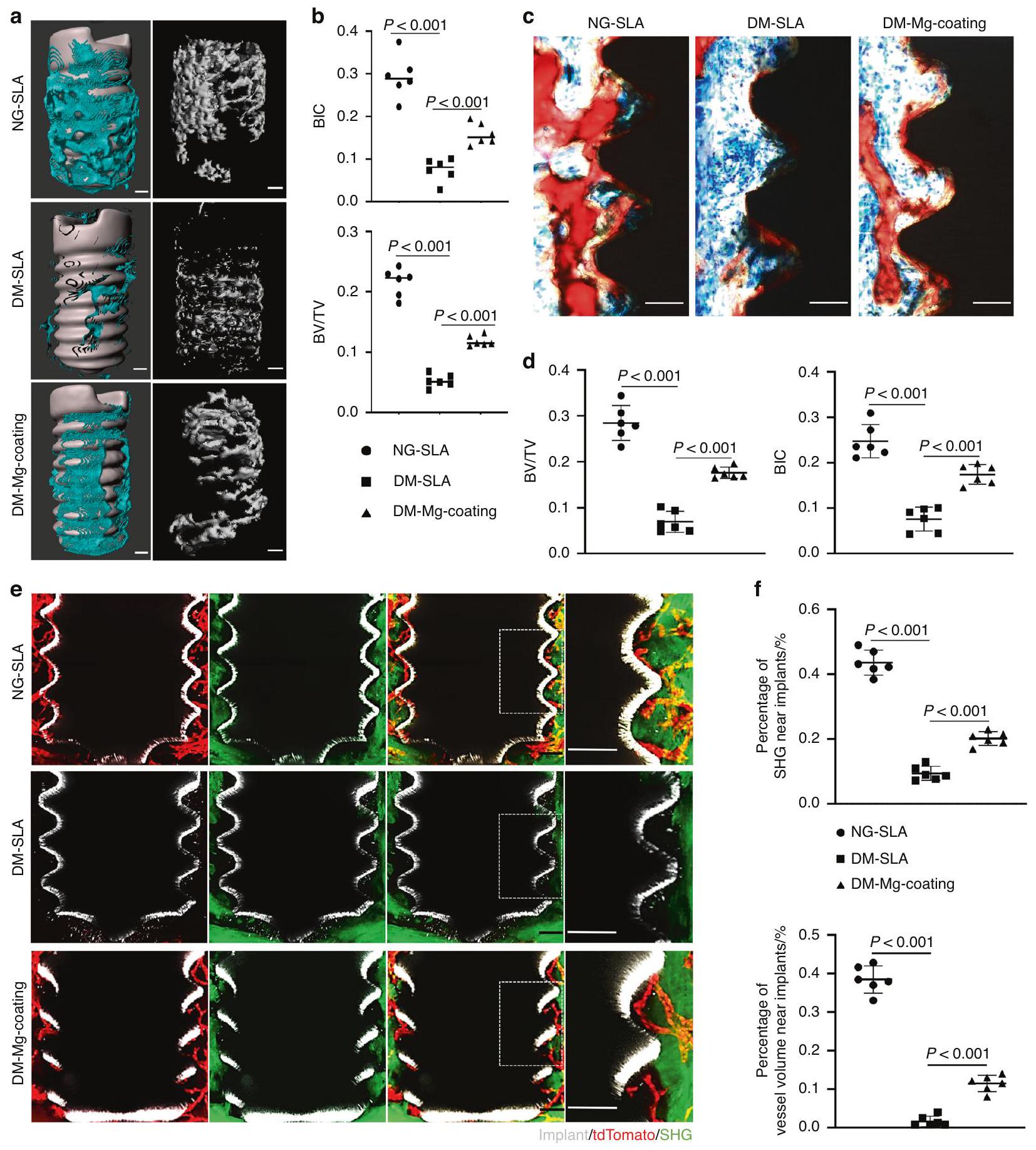 تم ملء نسيج العظام في المنطقة المجاورة لسطح الغرسات في مجموعة الطلاء بالمغنيسيوم (الشكل 5 ج، د). بدوره، المزيد من الطماطم