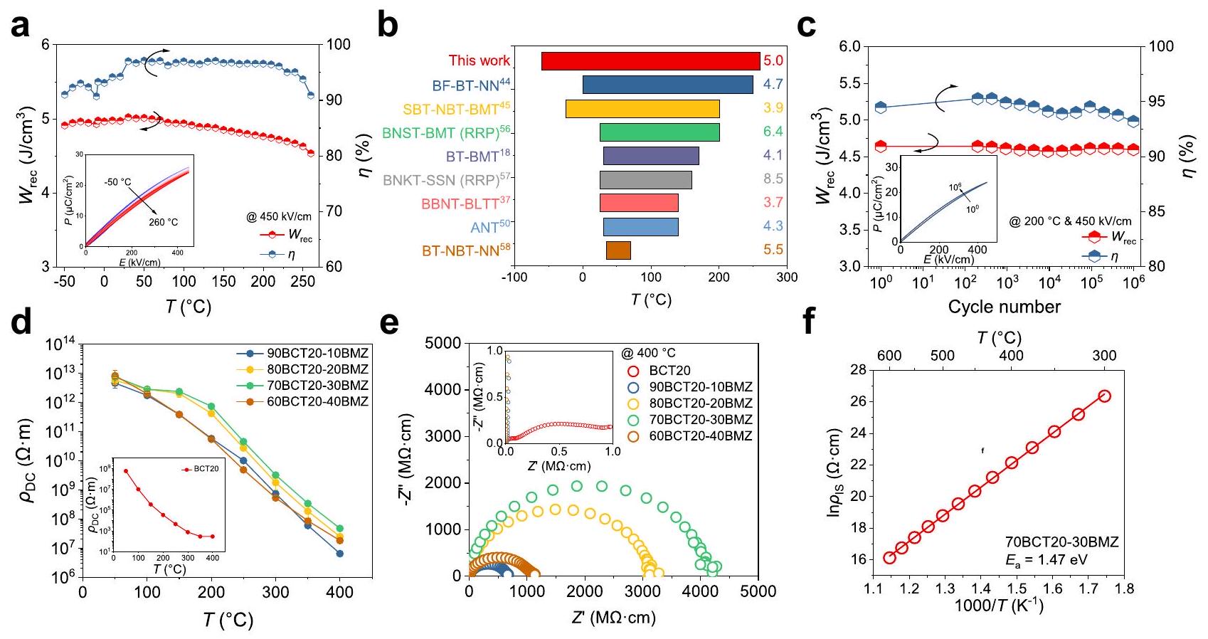 الشكل 3 | أداء تخزين الطاقة عند درجات حرارة عالية لسيراميك 70BCT20-30BMZ. أ و كوظائف لدرجة حرارة القياس. يظهر الشكل الداخلي – حلقات عند درجات حرارة مختلفة.نطاق درجات الحرارة الذي فيهلخزف 70BCT20-30BMZ وغيرها من خزفيات الاسترخاء. الرقم بالقرب من كل عمود يمثل درجة الحرارة في الغرفةتم قياس موثوقية الدورة عند و حتى الدورات. يظهر الرسم التوضيحي حلقات بعد دورات مختلفة. د تباينات المقاومة الكهربائية المستمرة ( ) مع درجة الحرارة لـ (100-100x) سيراميك BCT20-100xBMZ. تمثل أشرطة الخطأ الانحراف المعياري. e مخططات التعقيد للموصلية الخزف فيمخطط أرهينيوس لمقاومة الكتلة ) من سيراميك 70BCT20-30BMZ. موضحة في الشكل 3c والإطار، على التوالي.تظل الحلقات دون تغيير بعددوائر، مما يؤدي إلى الاستقرار و مع تباينات أقل من و على التوالي، مما يكشف عن موثوقية متفوقة عند درجات حرارة مرتفعة تصل إلى.
