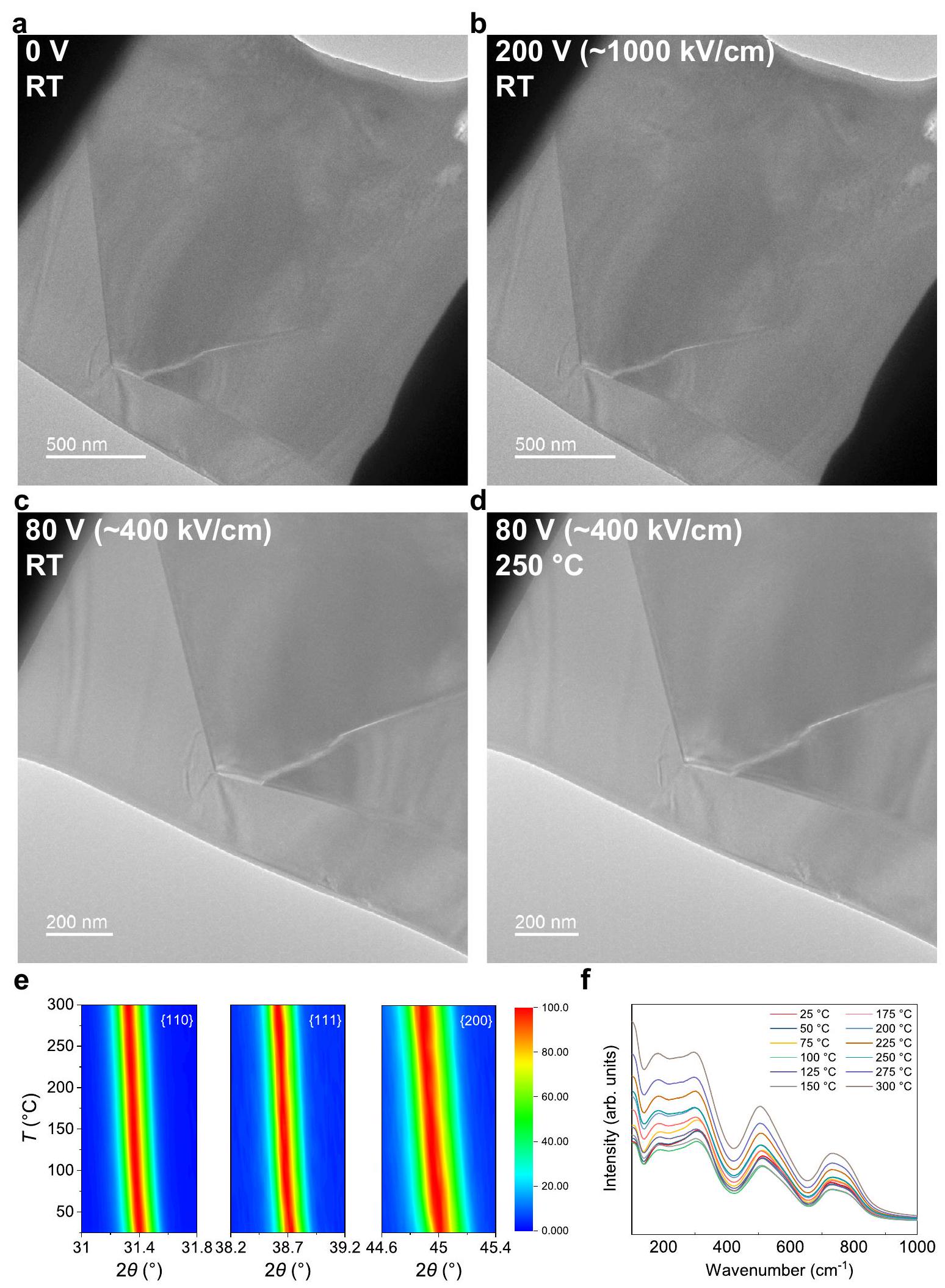 الشكل 4 | التوصيفات في الموقع لسيراميك 70BCT20-30BMZ. أ-ب صور TEM تم تسجيلها في درجة حرارة الغرفة وتحت 0 فولت و200 فولت، على التوالي. الأجزاء السوداء في أعلى اليسار وأسفل اليمين هي أقطاب بلاتينية. ج-د صور TEM تم تسجيلها تحت 80 فولت وفي درجة حرارة الغرفة و، على التوالي. e تم تكبير ، ، و قمم الانكسار تحت درجات حرارة مختلفة. تم تطبيع الشدات. طيف رامان المقاس تحت درجات حرارة مختلفة. تظهر السيراميك ديناميكية عالية تحت كل من درجات الحرارة العالية والحقول الكهربائية دون أن تتجمع في مجالات كبيرة، مما يتماشى مع الملاحظات منالحلقات المقاسة عند درجات حرارة مختلفة وحقول كهربائية متكررة.