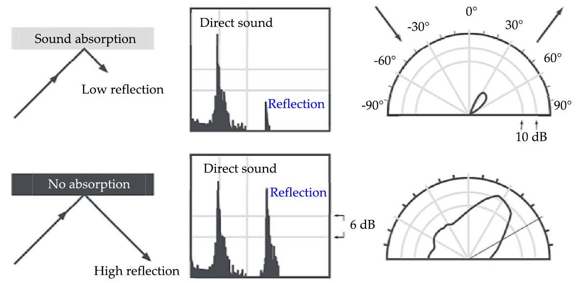تحددها الخصائص الصوتية للهيكل، وتسمى الأسطح التي تمتص الصوت بشكل فعال بممتصات الصوت الجيدة. يتم تصوير تمثيل بصري لبيئة المبنى مع وبدون علاجات امتصاص الصوت في الشكل 2، موضحًا الجوانب الزمنية والمكانية للصوت داخل مساحة معينة.