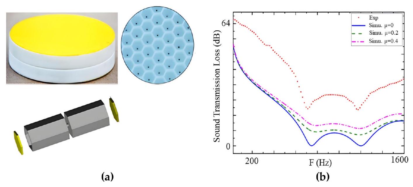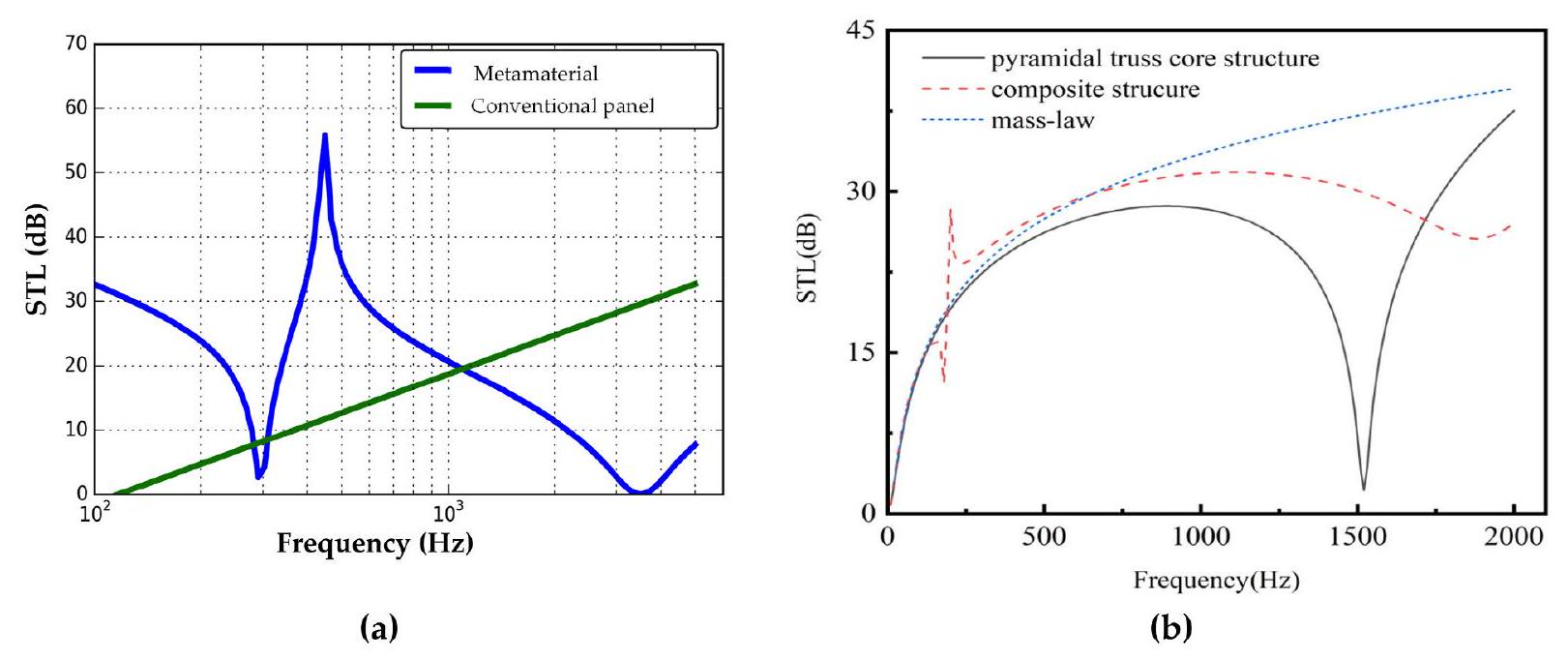 السعة الهيكلية، والكتلة الإضافية المفروضة، ونطاق نطاقات التردد المخففة. في محاولة لفهم تطبيقات تخفيف الصوت بشكل أفضل، قام أسوار وآخرون [156] بإجراء تقييمات نظرية ورقمية لسلوك مادة ميتامادية صوتية من نوع اللوحة في بيئة صوتية جوية. تم أخذ تكوينين في الاعتبار: أحدهما يعتمد على الأعمدة والآخر على النوابض والكتلة. لقد أظهروا أن المادة الميتامادية التي تم فحصها قد تولد فقدانًا كبيرًا في نقل الصوت (STL) في نطاق التردد الصوتي، مما يشير إلى أن النظام مناسب وفعال جدًا للتطبيقات التي تتضمن تخفيف الصوت والاهتزاز. علاوة على ذلك، اقترحوا أن المادة الميتامادية من نوع اللوحة يمكن أن تكون وسيلة محتملة للتغلب على قيود تردد التوافق، مما يؤدي إلى نقل صوت عالٍ عبر الألواح لتوفير الحماية الصوتية، من خلال استخدام رنانات منخفضة التردد مختارة بعناية.