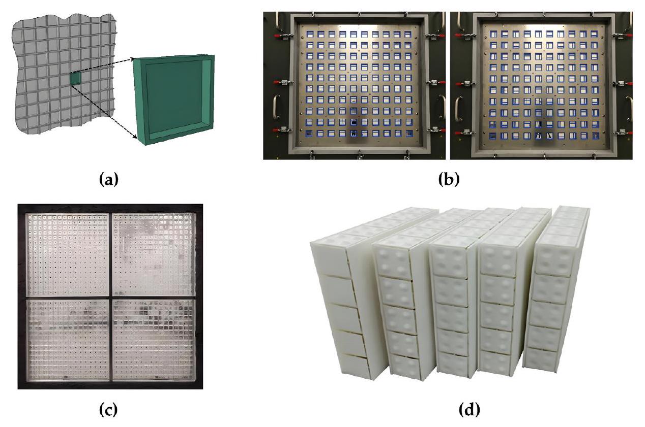 membrane type architecture, the latter is affected by the tension in the membrane which changes over repeated use limiting their applications in areas that require long term installation. In this regard, metamaterials featuring the plate type architecture may offer a higher likelihood for noise-reduction in buildings. A light weight ultrathin plate type acoustic metamaterial architecture consisting of nylon plate and elastic ethylenevinyl acetate copolymer was designed by Ma et al. [105]. The data revealed the plate type architecture to offer improved sound reduction along the low frequencies. According to Varanasi et al. [131], the plate-type metamaterials were found to possess a superior sound reduction index, as evidenced by a periodic array of unit cells comprising plates that are held within a grid-like framework, as shown in Fig. 18a. This design is slender and devoid of weighty resonating or restrictive elements that restrict its application. This plate-type metamaterial structure is also ideally suited for noise control applications where the goal is to minimize treatment mass while achieving a specified