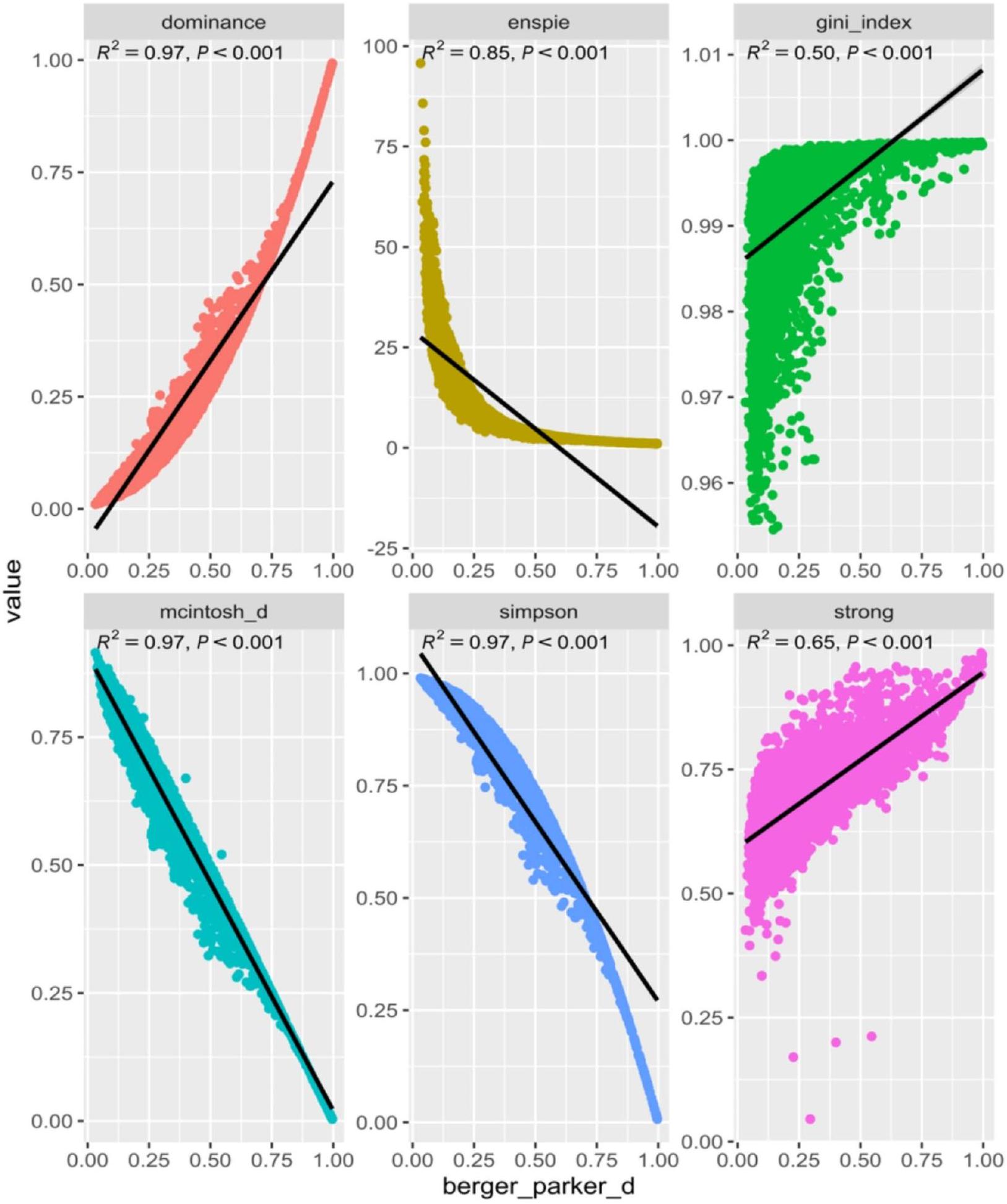 يمكن أيضًا ملاحظة ارتباطات غير خطية قوية بين مقاييس الهيمنة (S1b). الهيمنة وENSPIE هما نوعان من مقياس سيمبسون، وهما مرتبطان ارتباطًا قويًا ببعضهما كما هو متوقع. كما أن مقياسي مكينتوش وبرغر-باركر مرتبطان بهذه المقاييس. من المثير للاهتمام بشكل خاص أن برغر-باركر له تفسير بيولوجي أوضح من صيغته الرياضية (نسبة الأنواع الأكثر وفرة). تقدم الشكل 2، لكل مقياس في فئة الهيمنة، تحليل انحدار خطي باستخدام جميع العينات، حيث يمثل المحور السيني قيمة برغر-باركر ويمثل المحور الصادي قيمة المقياس المقابل. تظهر نماذج مكينتوش وسيمبسون توافقًا جيدًا. في حالة ENSPIE، يتناسب التحويل الأسي بشكل أفضل من النموذج الخطي. لا يتناسب مؤشر جيني جيدًا في هذا النموذج، كما أنه لا يتناسب جيدًا عند تطبيق نموذج الارتباط على جميع مقاييس الهيمنة.