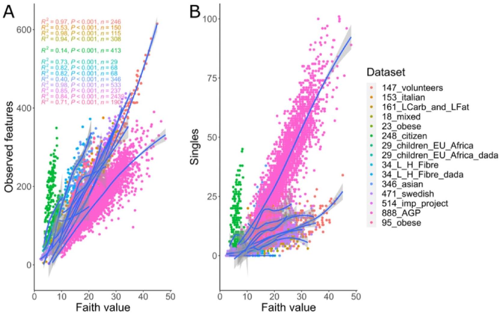 تم حساب 19 مقياسًا مختارًا لتنوع الألفا لمجموعات البيانات التسلسلية التي تم الحصول عليها لعدد إجمالي من 4,596 عينة براز مدرجة في 13 مشروعًا متاحًا للجمهور عن الميكروبيوم البشري (الجدول S3). تم إعادة تحليل جميع بيانات التسلسل لهذا البحث باستخدام نفس خط معالجة البيانات، كما هو موضح في الطرق.