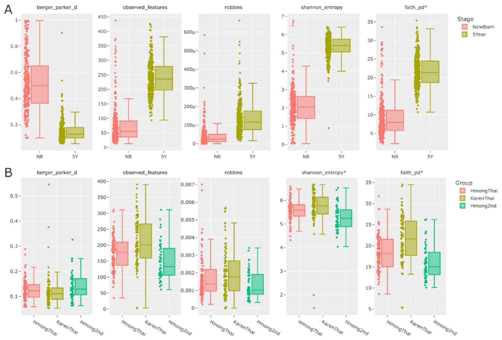 Fig. 4. Boxplots of each recommended alpha diversity metric for two datasets analyzed in this article, 471_ swedish (A) and 514_imp_project (B). Metrics with an asterisk (*) were reported by authors in their original studies.