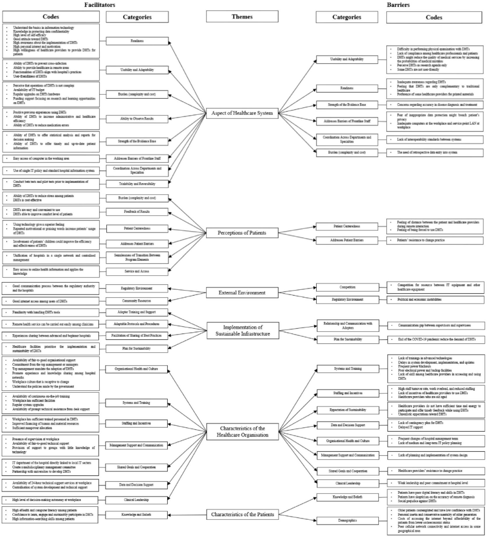 The relationship between codes, categories, and themes of facilitators and barriers to DHT implementation is summarized in Figure 2, in which the codes and categories are arranged from the most frequent (top) to the least frequent (bottom).