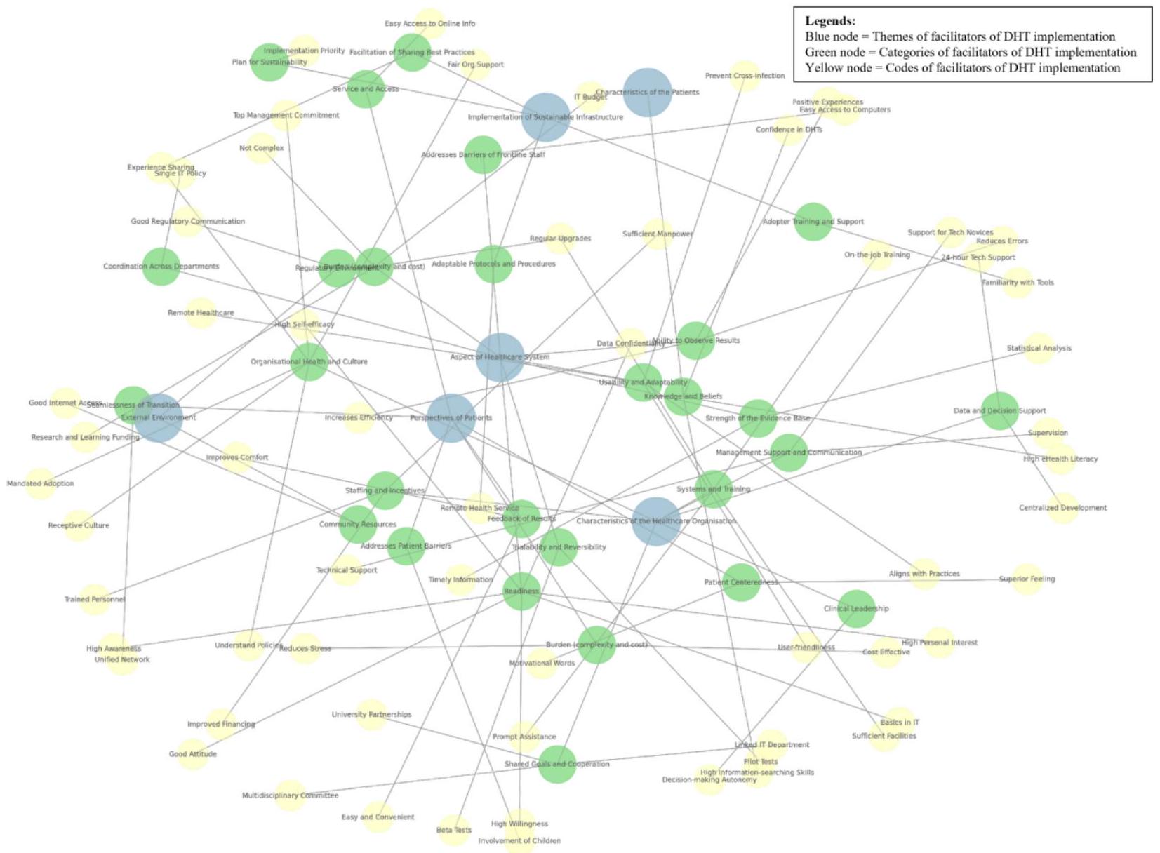 Figure 3. Network analysis to illustrate the relationship between the codes of facilitators of digital health technologies (DHTs) implementation in lower- and middle-income countries’ (LMICs) hospital settings since the onset of the COVID-19 pandemic.