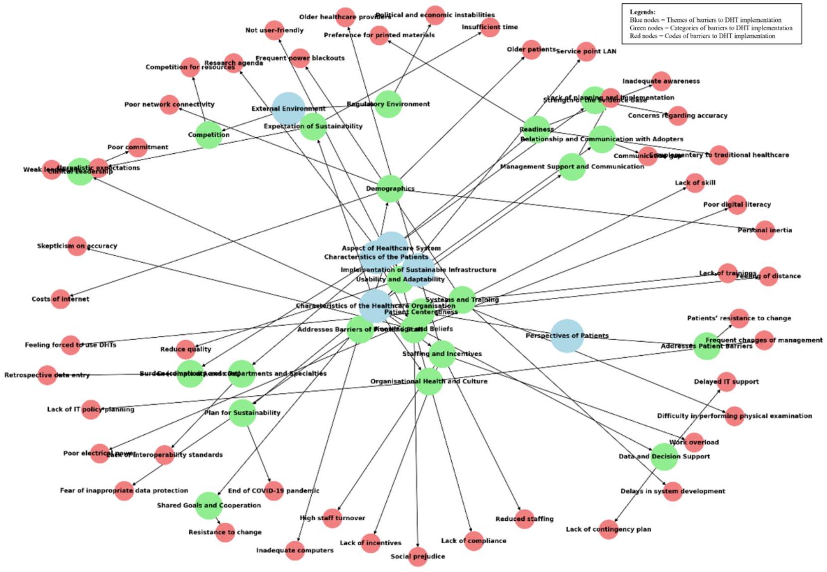 the Health Care System” barriers. Many barriers are interconnected, which indicate that addressing one (eg, “Characteristics of Health Care Organizations”) may alleviate others. However, it should be noted that some nodes, such as “Readiness” and “Usability and Adaptability,” can be both facilitators of and barriers to DHT implementation, and hence, can appear in both network analyses.