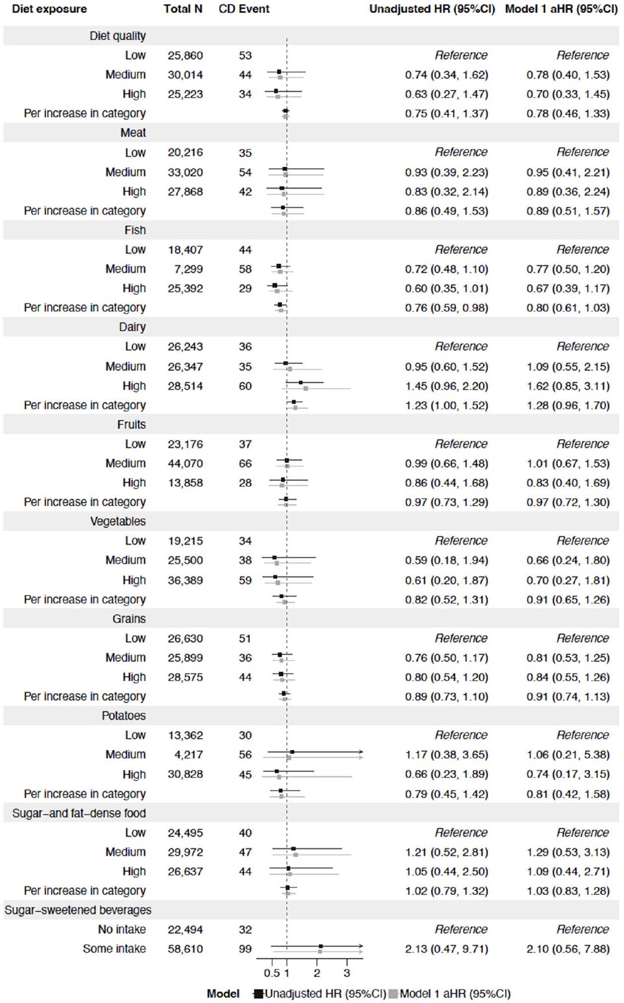 Diet exposure | Total N | UC Event | Unadjusted HR (95%CI) | Model 1 aHR (95%CI) | ||||||||||