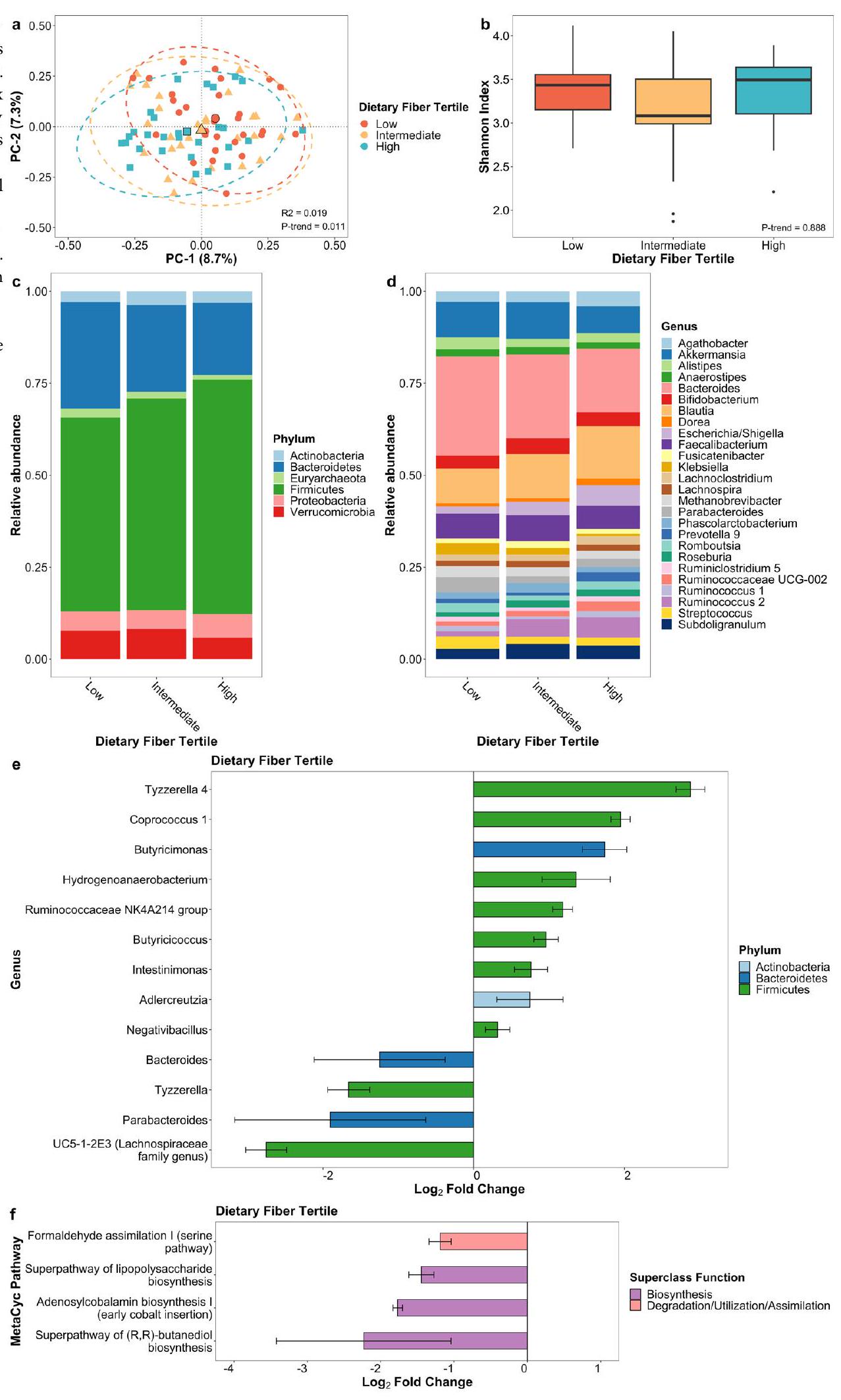 intake. These factors did not change reported results more than minimally and this approach avoids sparse data issues. All statistical tests were twosided. Taxa and pathways we considered differential in abundance were associated with diet at a