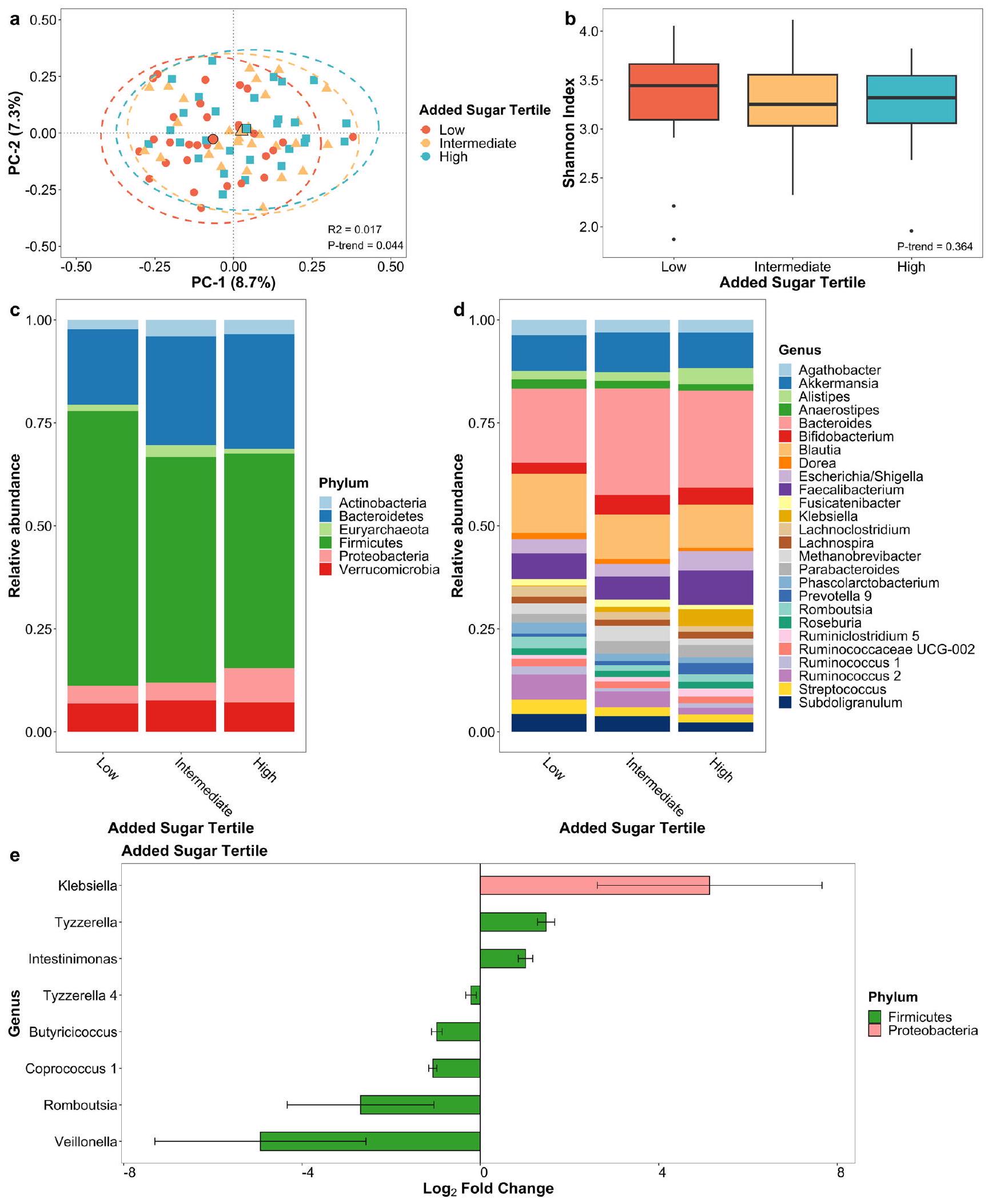 at genus level by added sugar intake after adjusting for age, sex, race, and sequencing platform. Taxa in (e) are associated with categorical added sugar intake tertile at