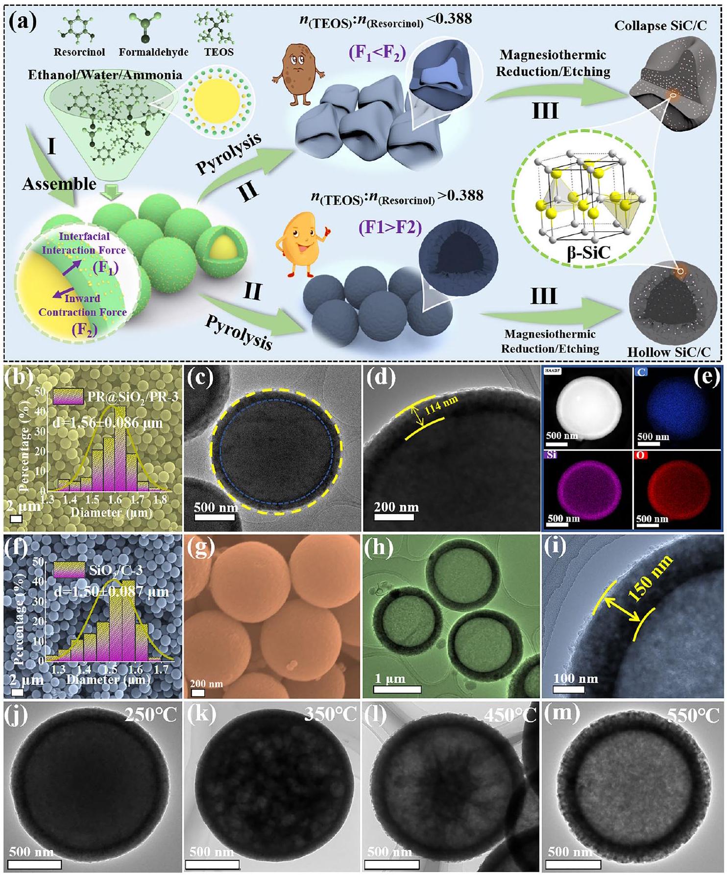 الشكل 1 أ آلية التحضير لمركبات SiC/C. ب صور SEM، ج-د صور TEM و هـ صور رسم العناصر المقابلة لـ PR@SiO PR-3. و-ز صور SEM و صور TEM لـ . ج-م صور TEM بدرجات حرارة تحلل مختلفة (250، 350، 450، و ) من