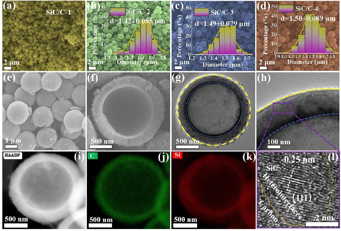 ، فإن وأنواع الكربون تتصل بشكل كامل (الشكل 1ج)، مما يضمن بشكل فعال توليد جزيئات SiC الكريستالية. يمكن إزالة المنتج الثانوي، MgO، بسهولة بواسطة معالجة HCl. من المثير للاهتمام أن جميع المركبات تظهر أشكالًا مشابهة جدًا لتلك الخاصة بالسابقة ، كما أن توزيعها الإحصائي للأقطار لا يظهر تغييرًا كبيرًا، مما يشير إلى أن قشور الكربون في هذه الكريات الميكروسكوبية مستقرة بما يكفي للبقاء على قيد الحياة من التفاعل المغنسيوم الحراري المكثف (الشكل 2ب-د). توضح كل من صورة SEM على كرة ميكروسكوبية مكسورة وصور TEM أن الهيكل المجوف قد تم وراثته بشكل جيد من مركبات ، حتى بعد التفاعل المغنسيوم الحراري (الشكل 2هـ-ح). تحدد صورة HR-TEM بعض جزيئات SiC فائقة الدقة في قشور الكربون، وحجمها أقل من 10 نانومتر (الشكل S4أ). يتضمن تشكيل جزيئات SiC حتمًا عمليات التكوين والنمو، بالإضافة إلى انتشار أنواع الكربون والسيليكون. قشور الكربون هي كربون صلب مشتق من الراتنج الفينولي، وبالتالي ستؤخر انتشار أنواع السيليكون بشكل كبير وتؤثر بشكل أكبر على عمليات التكوين والنمو. بعبارة أخرى، توفر قشور الكربون تأثير حبس فعال، مما يفسر الحجم الصغير جدًا لجزيئات SiC. المسافة الشبكية 0.25 نانومتر