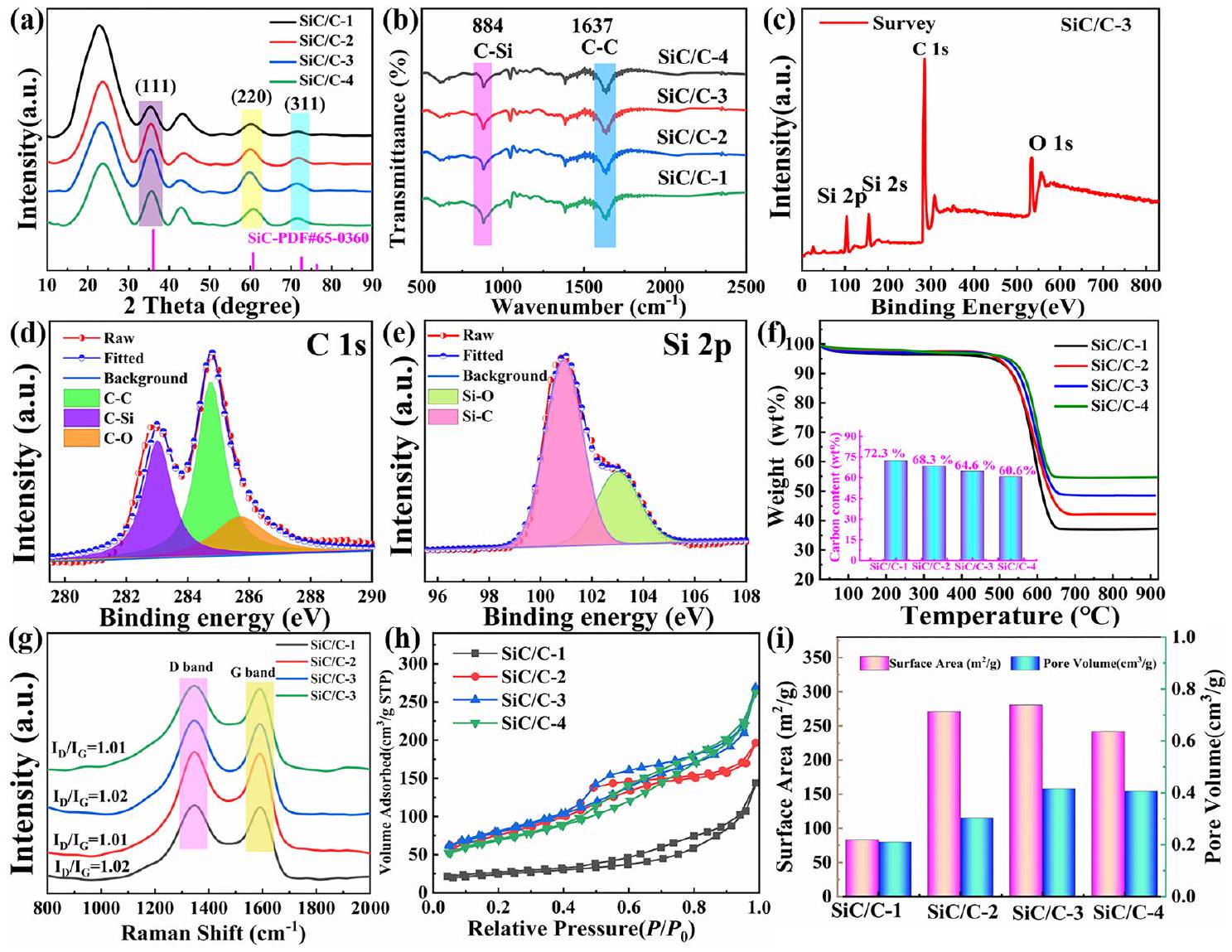 Fig. 3 a XRD patterns, b FT-IR spectra, c-e XPS survey spectra, and TG curves (Inset is the calculated contents of carbon), Raman spectra, h adsorption-desorption isotherms, and the histograms of BET surface areas and pore volumes of SiC/C composites