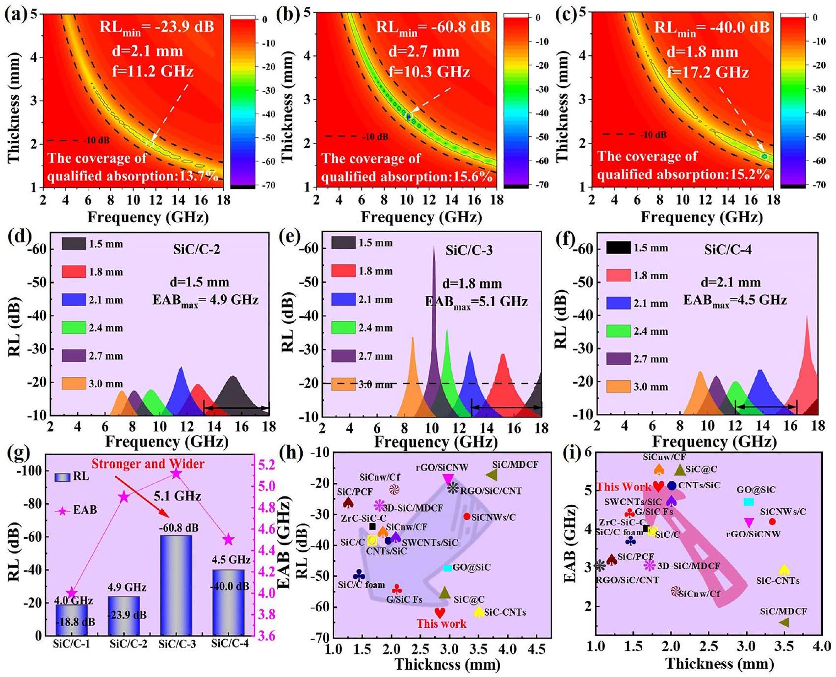significantly improved. For example, and harvest their values of and , while with more SiC nanoparticles, value of falls back to -40.0 dB ( ). On the other hand, the coverage of qualified absorption (i.e., ) is also different, and they are , and for , , and , respectively. For a more intuitive comparison in EABs, we further plot RL curves with some given absorber thickness (e.g., 1.5, 1.8, 2.1, 2.4, 2.7 , and 3.0 mm ) in Figs. S6b and 4d-f. It seems that the broadest EAB has a similar trend to that of intensity. achieves its best EAB in the frequency range of with an absorber thickness of 2.1 mm . Both and generates wider EAB than , and unfortunately, again presents an undesirable degradation in . When we compare the integrated performance of these composites (Fig. 4 g ), it will be easy to determine that is the best candidate among these composites because it have both strong absorption and broad response.