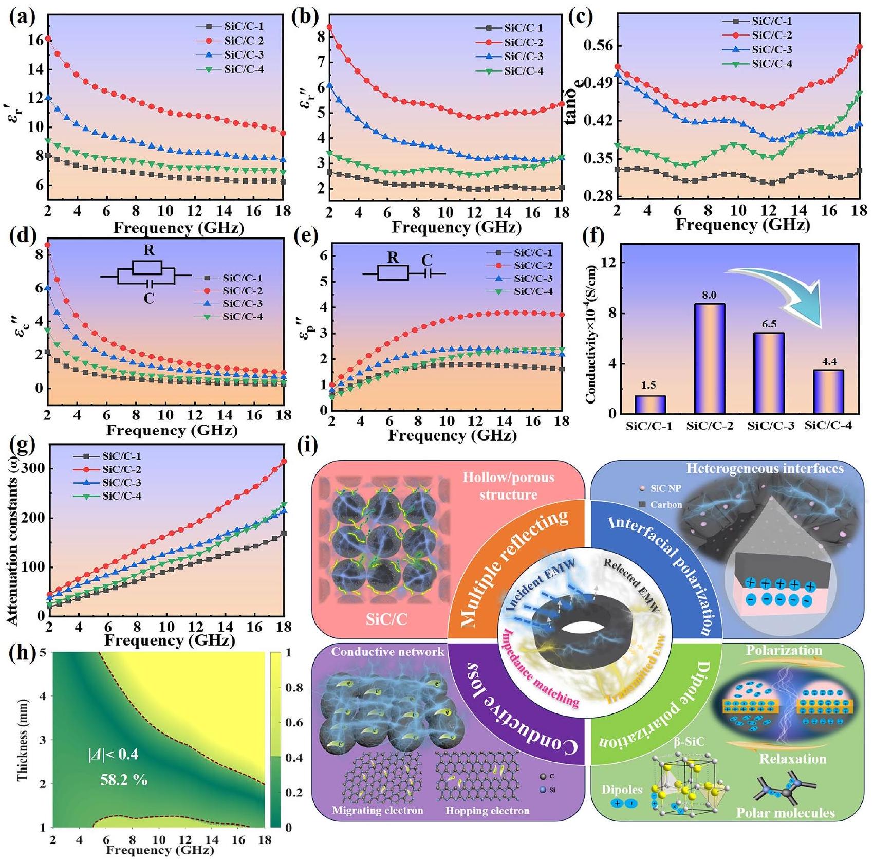 تكشف قياسات الموصلية بأربعة مجسات أنه تحت نفس تحميل الحشو في الشمع ( )، موصلية الأفلام مع ، و هم، و على التوالي (الشكل 5f). التغير في الموصلية هو نفسه كما في و القيم، مما يشير إلى فقدان الموصلية تلعب دورًا مهمًا في فقدان العزل. بشكل عام، يتم اعتبار استقطاب ثنائي القطب واستقطاب الواجهة كطريقتين حاسمتين يمكن أن تنتجا استهلاكًا كبيرًا للطاقة في نطاق التردد المدروس [25]. يشير الأول إلى حقيقة أن المجال الكهربائي يسبب عملية إعادة استقطاب هستيرية للثنائيات القطبية الجوهرية. هذا يعني أن تتأخر تغيرات هذه الأقطاب دائمًا عن المجال، وتميل إلى اكتساب الطاقة من هذا المجال لإكمال إعادة الترتيب، مما يؤدي إلى استهلاك الطاقة الكهرومغناطيسية. يتطلب ذلك وجود واجهات غير متجانسة بين مكونات أو مراحل كهرومغناطيسية مختلفة، حيث سيتم توليد الفرق في توزيع الشحنة السطحية على هذه الواجهات. يمكن أن تستجيب هذه العملية القطبية لتأثير الموجة الكهرومغناطيسية من خلال حركة شحنات الواجهة لتحقيق التخفيف. كما لوحظ، أربعةتظهر المركبات جميعها سلوكيات تشتت ترددي واضحة، وهي إشارات نموذجية لاستقطاب ثنائي القطب بسبب إعادة توجيه ثنائيات الأقطاب الهستيرية مع وجود مجال كهربائي مطبق. يمكن أن تعمل كل من المجموعات الوظيفية المتبقية ومواقع العيوب في هذه المركبات كمراكز استقطاب (أي، ثنائيات الأقطاب). يُعتقد أن الاستقطاب الوجهي يساهم أيضًا في فقدان العزل الكهربائي في هذه المركبات، لأنه يوجد العديد من الواجهات غير المتجانسة بين قشور الكربون وجزيئات SiC النانوية، وخاصة بالنسبة لـ، و همالقيم لا تتناقص باستمرار في النطاق الترددي العالي، مما يثبت تشكيل الاستقطاب السطحي [7]. نموذج الاسترخاء ديباي هو طريقة مهمة لدراسة آليات فقدان الاستقطاب ويمكن تمثيله بالمعادلة (4): أين هو الثابت الكهربائي الساكن، و هو ثابت العزل عند التردد اللانهائي. وفقًا لهذه المعادلة، سيكون هناك نصف دائرة في منحنى كول-كول المستمد من ضد عندما يحدث استرخاء قطبية ديباي، تستجيب كل نصف دائرة لعملية استرخاء واحدة تحت مجالات كهرومغناطيسية متناوبة. كما يمكن ملاحظة أنه سيتم تحديد عدة أنصاف دوائر في جميع مركبات SiC/C (الشكل S8)، وبالتالي هناك بالفعل عمليات استرخاء قطبية متعددة مسؤولة عن استهلاك الطاقة الكهرومغناطيسية، مما يؤكد المساهمة من فقدان القطبية. بالإضافة إلى ذلك، يمكن أيضًا اكتشاف ذيل شبه خطي في، و ، مما يعزز من صحة المساهمة الناتجة عن فقدان الموصلية [37، 61]. لتوضيح الآلية بشكل أكثر وضوحًا، نقوم أيضًا بتحديد المساهمة المحددة الناتجة عن فقدان الموصلية ( ) وفقدان الاستقطاب ( ) في مركبات مختلفة بناءً على نموذج استرخاء ديباي الذي تم ملاءمته بطريقة المربعات الصغرى (الشكل 5d، e) [62]. من الواضح أن مساهمة فقدان الموصلية ستتناقص تدريجياً مع زيادة التردد، وفي الوقت نفسه، فإن قوة فقدان الموصلية تتوافق بشكل كبير مع ترتيب الموصلات المختلفة.المركبات (الشكل 5f). على عكس التغيير في فقدان التوصيل، يزيد فقدان الاستقطاب لهذه المركبات تدريجياً من 2.0 إلى 18.0 جيجاهرتز. من الملحوظ،لديه فقدان استقطاب أكبر بكثير من1، والذي يمكن أن يُعزى إلى الجانبين التاليين: (1) زيادة محتوى SiC تجلب المزيد من الواجهات بين قشور الكربون وجزيئات SiC النانوية، مما يعزز الاستقطاب بين الواجهات؛ (2) تكامل الهيكل المجوف يحقق المزيد من الواجهات بين قشور الكربون والشمع، مما يزيد أيضًا من الاستقطاب بين الواجهات. ومع ذلك، منإلىتظهر خسارة الاستقطاب اتجاهًا هبوطيًا عامًا. من المحتمل أن زيادة محتوى SiC تضغط حتمًا على محتوى الكربون النسبي، وبالتالي سيتم قمع المساهمة من استقطاب توجيه ثنائي القطب بسبب قلة المجموعات الوظيفية المتبقية ومواقع العيوب. تشير هذه الظاهرة إلى أن استقطاب توجيه ثنائي القطب قد يلعب دورًا مهيمنًا نسبيًا في خسارة الاستقطاب.المركبات ذات الهيكل المجوف السليم، بينمامع أعلى محتوى من SiC لا ي