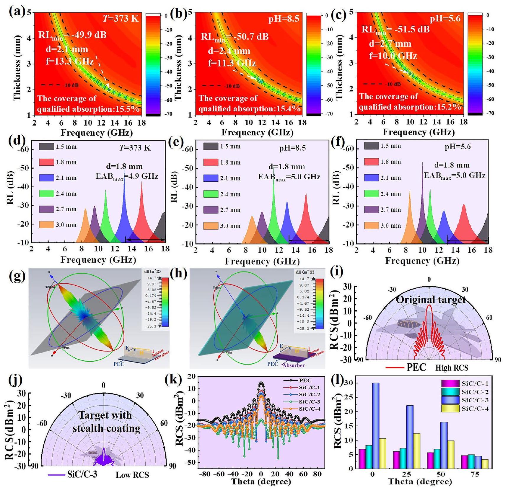 منفقط يضيق (الشكل 6د-و)، وتغطيات EAB في نطاق التردد يبقى فوق (الشكل 6أ-ج). حتى إذا عالجنا SiC/C-3 في محلول حمضي قوي ( محلول HCl) لمدة 120 ساعة، يمكنه أيضًا الحفاظ على أداء جيد في امتصاص الميكروويف (الشكل S19)، وعلى النقيض من ذلك، بعض المواد المغناطيسية التقليدية مثلوستتعرض النيكل للتآكل بشكل مكثف (الشكل S20). جميع هذه النتائج تؤكد بوضوح الآفاق الواعدة للتطبيق العملي لـ3. بالإضافة إلى ذلك، أداء التخفي للراداريستنتج أيضًا من صور الإشعاع البعيد ثلاثي الأبعاد وتوزيعات RCS ثنائية الأبعاد بزاوية كشف مختلفة للوحة الموصل الكهربائي المثالي (PEC) واللوحات المغلفة بمادة MAMs (الشكل 6g-1). ومن الجدير بالذكر أن شدة إشارة تشتت الرادار للوحة PEC الأصلية واضحة جدًا، بينما تصبح ضعيفة للغاية بعد أن يتم تغليفها بـ، مما يظهر تأثير قوي لتخفيف الموجات الكهرومغناطيسية (الشكل 6g-j). كما هو موضح في الشكل 6k، 1، فإن أكبر قيم تقليل RCS للمواد الموصلة المغلفة بـ، و هم و عند زوايا الرمي تتغير منإلى، على التوالي. تُظهر هذه النتيجة أن جميع الـ تساهم العينات في تقليل قيم RCS، لكنلديه أعلى قيم تقليل RCS بينها، أي أنه يمكنه تحقيق أداء أفضل في تقليل موجات الرادار. التحليل أعلاه يوضح أنتظهر المواد المركبة استقرارًا بيئيًا جيدًا وأداءً خفيًا أمام الرادار، مما يدل على إمكانيات ممتازة للتطبيق العملي.