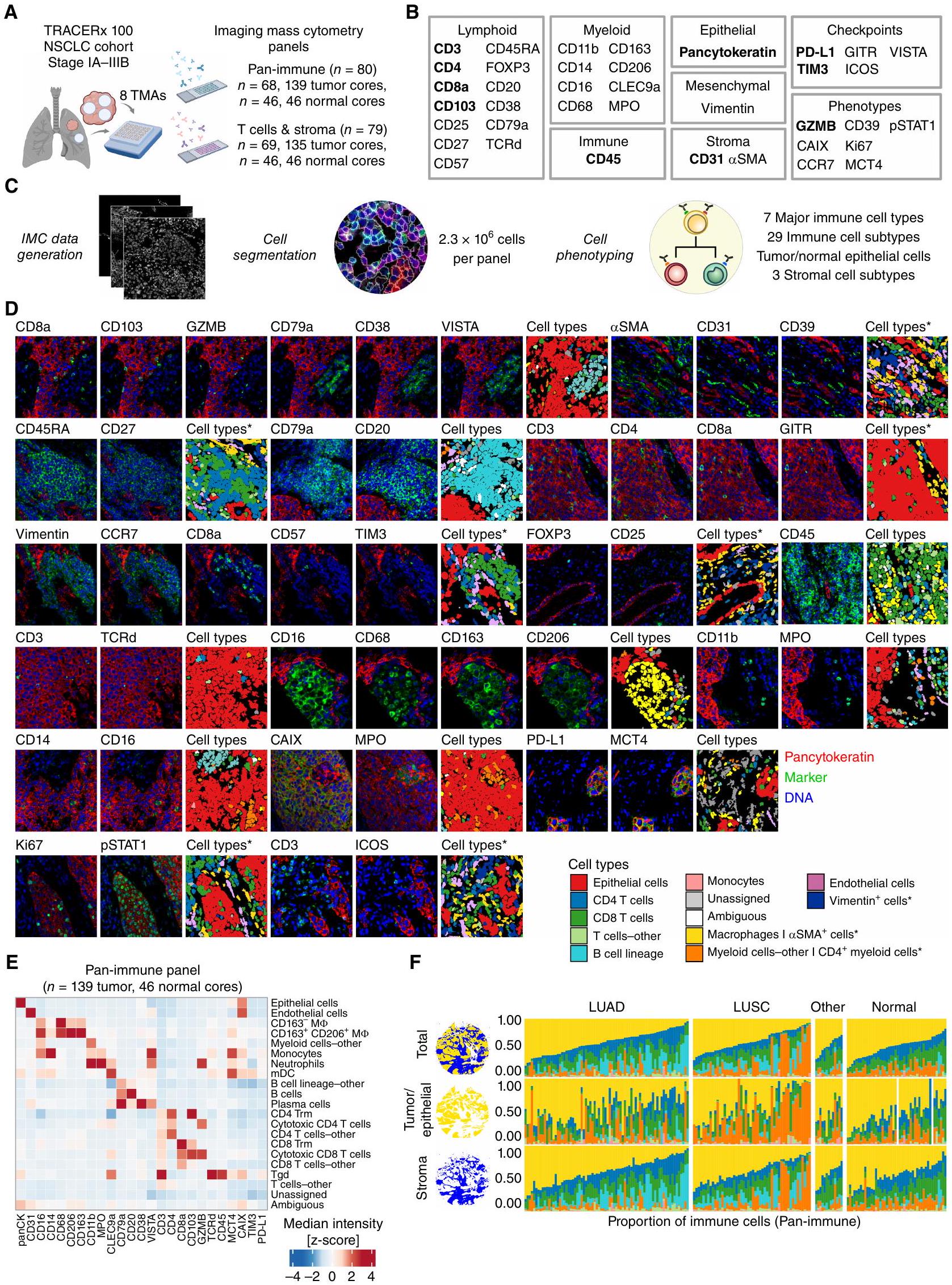 بهدف فهم دور البيئة المجهرية للورم في تطور الأورام، قمنا بإجراء تحليل عميق مكاني وسماتي للبيئة المجهرية للورم في سرطان الرئة غير صغير الخلايا في مراحله المبكرة (I-IIIA) والذي لم يتلقَ علاجًا بعد. قمنا بتوصيف التنوع في أنماط الخلايا، والمجتمعات المكانية المتكررة، وفئات البيئة المجهرية الأوسع في مجموعة TRACERx 100 متعددة المناطق. باستخدام تقنية IMC، قمنا بتوصيف التعبير في الموقع لـ 38 علامة على مصفوفات الأنسجة الدقيقة (TMA) لعينات الورم المنفصلة مكانيًا وعينات الرئة الطبيعية المجاورة التي تم الحصول عليها أثناء الاستئصال الجراحي. تم تحليل تنظيم البيئة المجهرية للورم باستخدام لوحة الأجسام المضادة المناعية الشاملة التي تستهدف أنواع خلايا المناعة الفطرية والتكيفية.185 نواة؛ الشكل 1B؛ الجدول التكميلي S1). تم استجواب حالات تمايز خلايا T الإضافية والخلايا الداعمة غير المناعية باستخدام لوحة خلايا T والستروما.أنواع الأنسجة الرئيسية لسرطان الرئة غير صغير الخلايا كانت ممثلة في المجموعة، بما في ذلك LUAD (الأورام، 76 نواة، لوحة مناعية شاملة)، سرطان الخلايا الحرشفية الرئوي (LUSC؛، 50 نواة)، وأنسجة أخرى من سرطان الرئة غير صغير الخلايا (NSCLC-أخرى؛أنسجة الرئة الطبيعية المجاورة (تمتلك بيانات IMC من عدة نوى ورمية متاحة لـ 41 من الأورام الممثلة. كان لدى اثني عشر مريضًا بيانات IMC متاحة فقط من نوى الرئة الطبيعية المجاورة. كانت الغالبية العظمى من النوى تمت دراستهم باستخدام لوحات IMC (168/198) وتوافرت بيانات تسلسل WES و RNA (RNA-seq) المزدوجة (الشكل التوضيحي التكميلي S1A-S1C؛ الجدول التكميلي S2؛ الطرق).