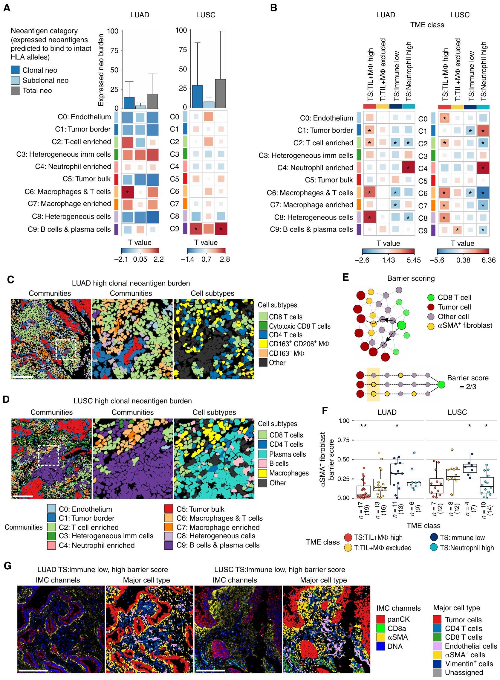 في LUSC، كانت عبء المستضدات النيوانية المعبر عنها والمجموع الكلي المتوقع أن ترتبط بالأليلات HLA السليمة مرتبطًا بخلايا C9:B وخلايا البلازما (LME )، مجتمع غني في T:TIL+MФ مستبعد TMEs ومفتقر في TS: كريات الدم البيضاء العالية TMEs (الشكل 3A وB وD). كانت كل من خلايا B وخلايا البلازما مُعزَّز في المجتمعالخلايا وخلايا البلازما، ولكن فقط كثافات خلايا البلازما الموجودة في السدى كانت مرتبطة بشكل كبير مع الحمل الكلوني والإجمالي للنيوانتجين في سرطان الرئة ذو الخلايا الحرشفية (الأشكال التكميلية S3F و S6A). تكشف هذه التحليل المكاني أن خلايا البلازما والمجتمع الذي تعيش فيه مرتبطة ليس فقط بارتفاع TMB ولكن أيضًا بحمل النيوانتجين الكلوني والإجمالي في مراحل مبكرة من سرطان الرئة ذو الخلايا الحرشفية.