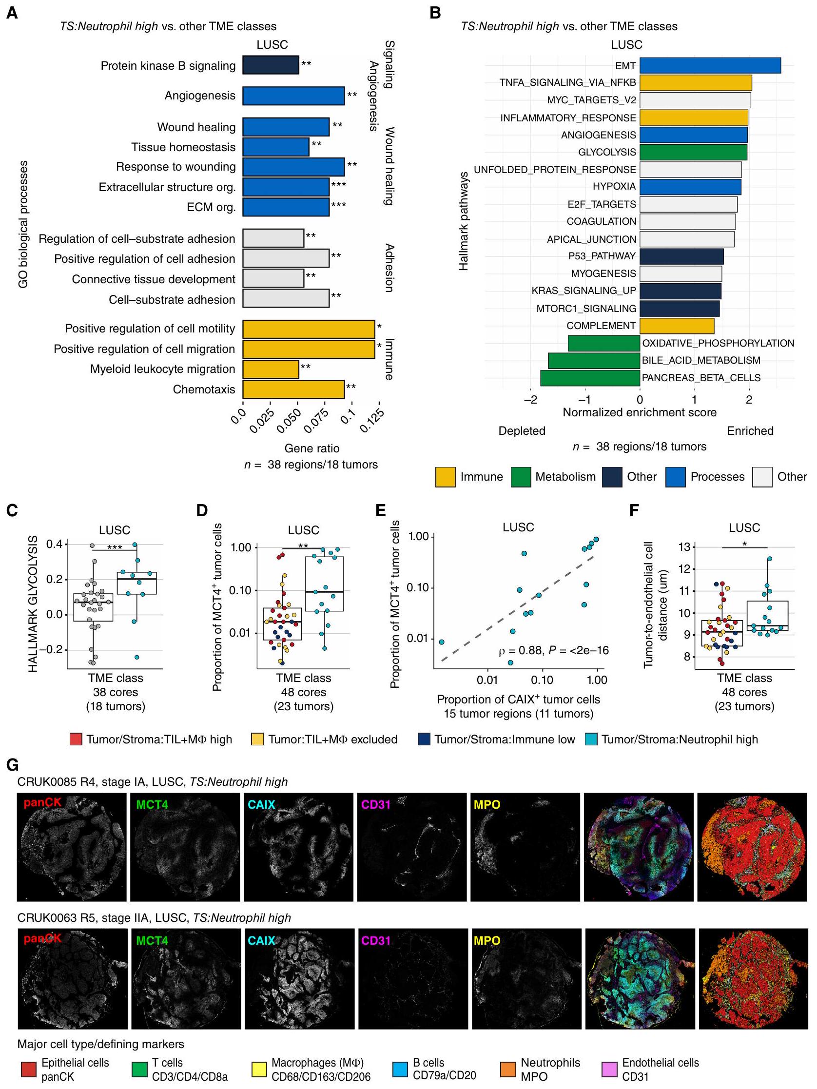 الشكل 4. يرتبط تسرب العدلات في LUSC بأنماط أيضية ومناعية مثبطة مميزة. أ، العمليات البيولوجية في علم الأحياء الجيني (GO) الغنية بين الجينات المرتفعة في فئة TME العالية للعدلات: النوى) مقارنة مع فئات TME الأخرى مجتمعة (النوى) في LUSC (FDR < 0.01، نسبة الجين > 0.05). ب، تحليل GSEA لمجموعات الجينات الرئيسية مقارنة بين نوى الورم من فئة Tumor/Stroma:Neutrophil العالية في TME والفئات الأخرى من TME مجتمعة، باستخدام إحصائية t المستمدة من نموذج limma-voom على تعبير الجين المعاير بواسطة TMM. تم تلوين المسارات الغنية بشكل ملحوظ حسب نوع المسار (FDR < 0.05). ج، درجة الغنى المعايرة المستمدة من GSEA لعينة واحدة تم تصورها لفئة TS:Neutrophil العالية ونوى من فئات TME الأخرى. القيمة مشتقة من GSEA لـ LUSC كما هو موضح في وتم تعديلها لمسارات العلامات الأخرى باستخدام طريقة بنجاميني-هوشبرغ. د، نسبة خلايا الورم المعينة MCT4+ في نوى الأورام ذات نسبة عالية من TS:العدلات مقارنة بنوى الأورام من فئات TME الأخرى مجتمعة في LUSC. هـ، معامل ارتباط سبيرمان وقيمة مقارنة نسبة MCT4و CAIXخلايا الورم في TS: بيئات الورم عالية العدلات. F، المسافة المتوسطة بين خلايا ورم LUSC وأقرب خلية بطانية لكل نواة في فئة TME عالية العدلات مقارنة بجميع فئات TME الأخرى مجتمعة. G، صور أحادية القناة وصورة مركبة بجانب خريطة نوع الخلية تعرض خلايا الورم، العدلات (MPO، أصفر)، الخلايا البطانية (CD31، أرجواني)، ومناطق نقص الأكسجة (CAIX، أزرق) وتعبير MCT4 (أخضر). تظهر الرسوم البيانية الصندوقية القيم المتوسطة وقيم الربع السفلي والربع العلوي، وتمتد الشعيرات حتىالمدى بين الربيعيات فوق وتحت الربيعيات.قيم لـ و تم حسابها في نموذج تأثيرات مختلطة خطية مع المريض كمتغير عشوائي. LUSC، سرطان الخلايا الحرشفية الرئوية؛ TS، الورم/الستروما؛ FDR، معدل الاكتشاف الخاطئ؛ TMM، المتوسط المقصوص لقيم M؛ panCK، بانسيتيكراتين؛ *، P < 0.05؛ **، P < 0.01؛ ***, P < 0.001. فئة TME العالية من العدلاتقمنا بتقييم القرب من الأوعية الدموية كالمسافة المتوسطة بين كل خلية ورمية وأقرب خلية بطانية ووجدنا مسافة أكبر بشكل ملحوظ في فئة TS:Neutrophil العالية مقارنة بالفئات الأخرى في LUSC. كانت مستويات تكاثر الورم التي تم تقييمها كنسبة خلايا الورم Ki-67+ أقل في فئة TS:Neutrophil العالية مقارنة بالفئات الأخرى في TME في LUSC. تشير هذه النتائج إلى أن الزيادة في النشاط الجليكوليتي في هذه الفئة من TME مرتبطة بانخفاض في إمدادات الأكسجين في الأورام التي تكون على مسافة أكبر من الأوعية الدموية.