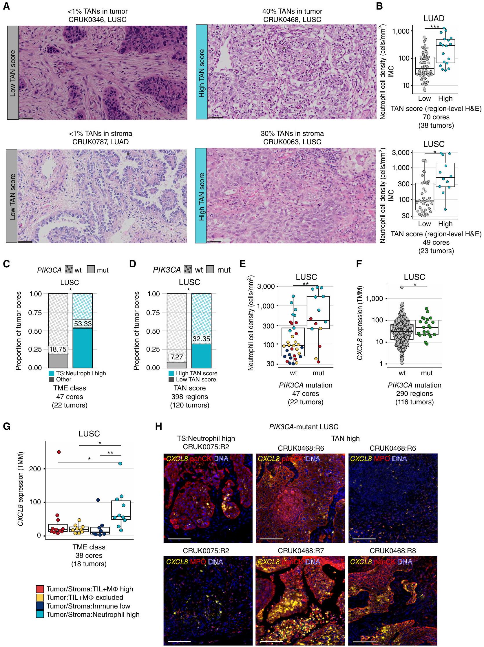 الشكل 5. ترتبط البيئات المجهرية الغنية بالعدلات بطفرات تنشيطية في PI3K وزيادة تعبير CXCL8 المرتبطة بالورم. أ، قصاصات تمثيلية من صور H&E على مستوى الورم مع درجات TAN منخفضة في عشة الورم والستروما (يسار) ودرجات TAN مرتفعة في عشة الورم والستروما (يمين)، مستنتجة كنسبة منطقة العدلات في الورم/الستروما من إجمالي منطقة نسيج الورم/الستروما. مقياس الرسم،التكبير. ب، كثافة خلايا العدلات كما تم تعريفها بواسطة IMC مقارنة بين نوى الأورام ذات مستوى TAN المنخفض مقابل TAN المرتفع بناءً على درجات H&E في LUAD و LUSC. ج ود، نسبة نوى الأورام مع (mut) وبدون (wt) طفرات محرك PIK3CA مقارنة بين TS: العدلات العالية مقابل الفئات الأخرى من TME مجتمعة (ج) ونوى TAN المرتفعة مقابل TAN المنخفضة على مستوى المنطقة (د) في LUSC. تم اشتقاق قيم P من اختبار كاي-تربيع. هـ، كثافة خلايا العدلات حسب حالة طفرة PIK3CA، النقاط ملونة حسب تعيين فئة TME. و وز، قيم تعبير TMM لـ CXCL8 مقارنة بحالة طفرة PIK3CA (و) وبين فئات TME (ز) في LUSC. ح، صور المناعة الفلورية لـ CXCL8 RNAscope متعددة الأبعاد مع صبغة الأجسام المضادة لـ pancytokeratin (panCK) أو MPO في منطقة ورم LUSC مع TME عالية العدلات وطفرات PIK3CA تحت خلوية، ومريض LUSC مع مناطق ورم متعددة عالية TAN وطفرات PIK3CA خلوية. توضح أمثلة panCK و MPO لـ CRUK0075:R2 نفس منطقة الاهتمام، بينما تظهر مناطق اهتمام مختلفة لـ CRUK0468:R6. شريط القياس، . قيم لـ و تم حسابها في نموذج مختلط ذو تأثيرات خطية مع المريض كمتغير عشوائي.القيم في و تم اشتقاقها من تحليل التعبير التفاضلي limma-voom مع تصحيح لعدة مناطق لكل ورم.سرطان الرئة الغدي؛ LUSC، سرطان الرئة ذو الخلايا الحرشفية؛ TMM، المتوسط المقصوص لقيم M؛ TS، الورم/الستروما؛ TIL، اللمفاويات المتسللة إلى الورم؛ Mالخلايا البلعمية؛ TAN، العدلات المرتبطة بالورم؛ H&E، الهيماتوكسيليين والإيوزين؛ mt، الطافرة؛ wt، النوع البري.