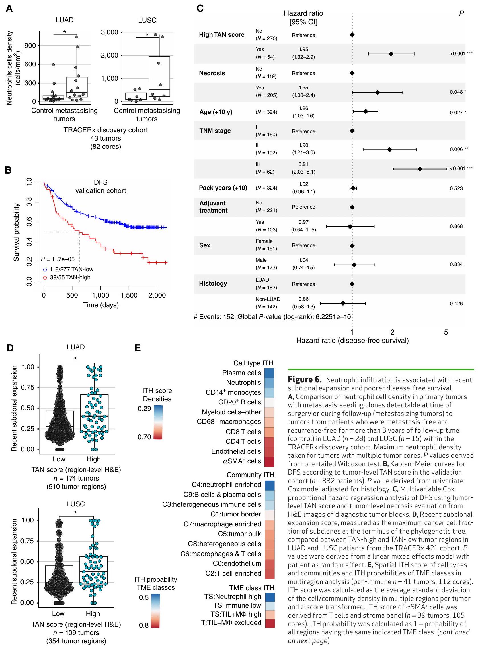 لقد سعينا لتأكيد هذه الملاحظة في مجموعة تحقق منفصلة ضمن TRACERx باستخدام نظام تسجيل TAN المستمد من صبغة H&E. المرضى؛ الشكل التوضيحي التكميلي S10A؛ الجدول التكميلي S3). افترضنا أن الأورام الرئوية غير الصغيرة الأولية التي تحتوي على بيئة ميكروية غنية بالعدلات تزرع النقائل بشكل أكثر تكرارًا، وبالتالي، كانت لديها مخاطر أعلى للانتكاس بعد إزالة الورم الأساسي جراحيًا. أظهر تحليل البقاء الخالي من المرض (DFS) أحادي المتغير ارتباطًا كبيرًا بين درجات TAN العالية على مستوى الورم و DFS أسوأ في NSCLC ( )، مع متوسط فترة البقاء خالية من المرض (DFS) لمدة 21 شهرًا للدرجات العالية مقارنة بأكثر من 70 شهرًا للدرجات المنخفضة (الشكل 6B). كانت هذه العلاقة التنبؤية مستقلة عن الحد المستخدم لتعريف درجات TAN وتم الحفاظ عليها لكل من درجات TAN على مستوى الورم وعلى مستوى المنطقة (الشكل التكميلي S10B و S10C؛ الطرق). بالإضافة إلى ذلك، كانت درجة TAN العالية على مستوى الورم مرتبطة أيضًا بشكل قوي بفترة بقاء خالية من المرض أقصر في LUAD (HR ) و LUSC (HR = 2.13، )، بشكل منفصل (الشكل التكميلي S10C).