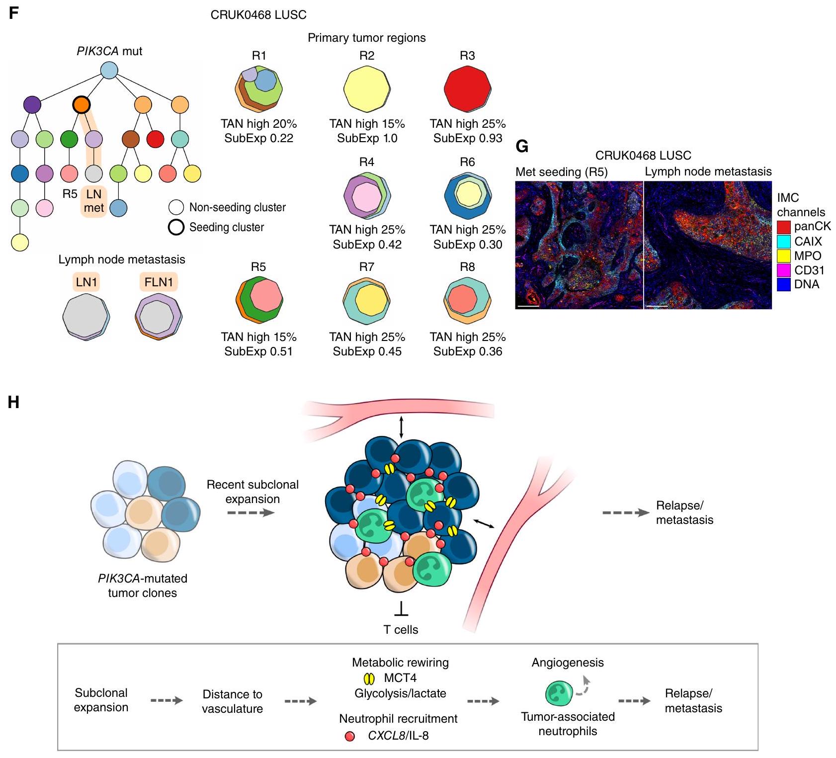 المريض CRUK0468 تم تشخيصه بمرحلة IIIA من سرطان الرئة غير صغير الخلايا، على سبيل المثال، يحمل ورمًا عالي TAN مع تباين مكاني منخفض. جميع المناطق الثمانية المأخوذة من الورم الأساسي كانت تحتوي على تسلل عالي من العدلات مع درجة عالية من TAN وطفرات متكررة في جين PIK3CA. أظهرت سبع مناطق درجة توسع تحت سلالي حديث أعلى من الوسيط في المجموعة، بما في ذلك المنطقة التي أطلقت نقيلة في العقد اللمفاوية، R5 (الشكل 6F). المنطقة المصدرة، R5، والنقيلة في العقد اللمفاوية المشتركة كانت تتميز بخصائص TME: تسلل عالي من العدلات والتعبير على طول حواف عُش النسيج الورمي، الذي تم تحديده باستخدام IMC في الورم الأساسي ومنطقة النقائل (الشكل 6G).