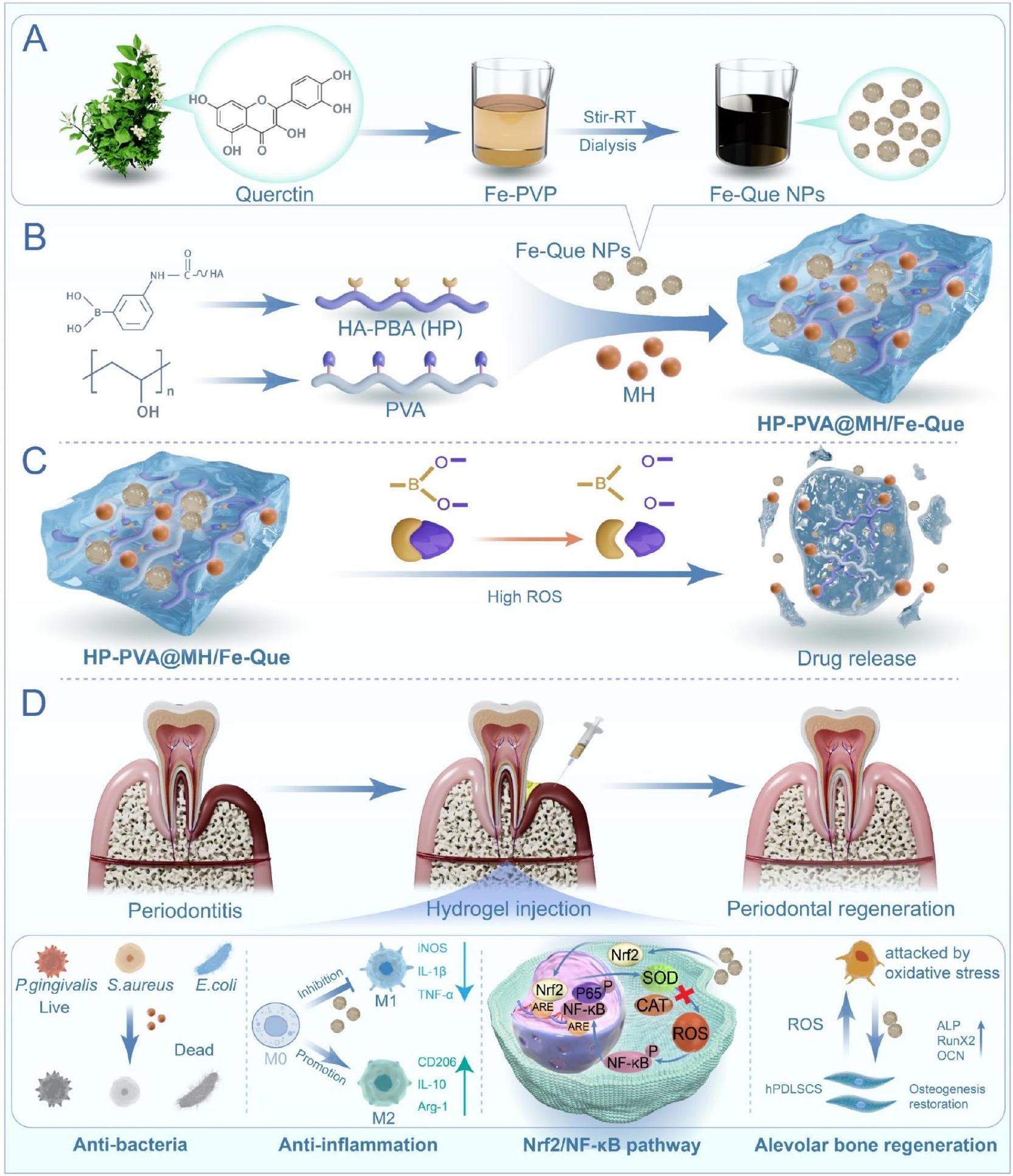 في هذه الدراسة، كما هو موضح في المخطط 1، تم تشكيل جزيئات نانوية فائقة الصغر من Fe-Que أولاً من خلال تنسيق الكيرسيتين مع أيونات الحديد منخفضة السمية. بالإضافة إلى ذلك، تم تطعيم حمض الهيالورونيك (HA) مع 3-أمينوفينيل بورات (HA-PBA، HP)، والذي تفاعل بعد ذلك مع مجموعة 1،3-ديول من بولي (الفينيل الكحول) (PVA) لتشكيل رابطة بورات، مما أدى إلى بناء هيدروجيل بخصائص استجابة ROS. تم إدخال MH وFe-Que لتحضير نظام هيدروجيل HP-PVA (HP-PVA@MH/Fe-Que). في بيئة ROS العالية لالتهاب اللثة، تم كسر رابطة البورات، مما أدى إلى تسريع إطلاق MH وFe-Que. الجزيء الصغير MH يقتل البكتيريا بسرعة، ثم تقوم جزيئات Fe-Que بالتخلص من ROS، وتقليل الاستجابة الالتهابية للأنسجة اللثوية، وتخفيف امتصاص العظم السنخي. تم تقييم الخصائص الفيزيائية، وخصائص إطلاق الدواء، والنشاط المضاد للبكتيريا، والتوافق الحيوي لمركب HP-PVA@MH/Fe-Que بالتفصيل. أظهرت هذه الدراسة أن هيدروجيل HP-PVA@MH/Fe-Que قام في البداية بسرعة بتثبيط نمو البكتيريا من خلال MH. بعد ذلك، قامت Fe-Que بالتخلص من ROS عبر مسار Nrf2/NF-кB، وتنظيم استقطاب البلعميات لتقليل العوامل المؤيدة للالتهاب وزيادة العوامل المضادة للالتهاب، بينما حمت أيضًا hPDLSCs من الأضرار الناتجة عن ROS وعززت التمايز العظمي تحت الضغط التأكسدي. تم تأكيد قدرة هيدروجيل HP-PVA@MH/Fe-Que على التخلص من ROS وتخفيف الالتهاب وامتصاص العظم السنخي أيضًا في نموذج التهاب اللثة المزمن SD. لذلك، مع فعالية علاجية ملحوظة في المختبر وفي الجسم الحي، قد يكون لهيدروجيل HP-PVA@MH/Fe-Que إمكانات كبيرة لعلاج التهاب اللثة.