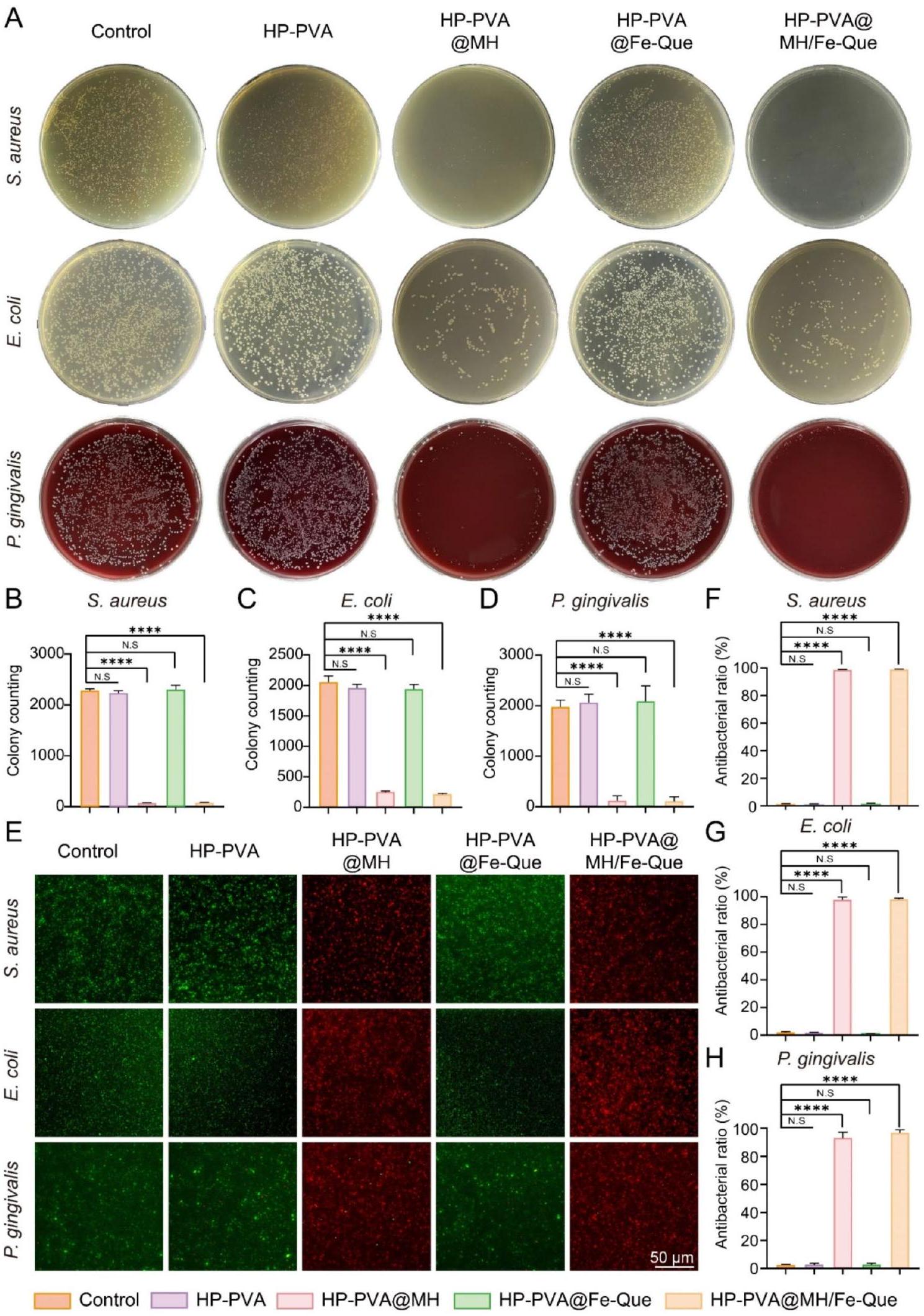أشارت النتائج إلى أن الهيدروجيل HP-PVA و HP-PVA@Fe-Que لم يشكلا مناطق تثبيط ملحوظة، بينما أظهرت مجموعات HP-PVA@MH و HP-PVA@MH/Fe-Que مناطق تثبيط واضحة ضد جميع البكتيريا المختبرة، بما في ذلك S. mutans (الشكل S7). كانت هذه النتائج متسقة مع نتائج عدّ مستعمرات البكتيريا. لذلك، كان الهيدروجيل المحمّل بمضاد الميكروبات MH يتمتع بقدرة مضادة للميكروبات ممتازة وعمل على المحفزات المسببة لالتهاب اللثة لتحقيق تأثير علاجي كبير.