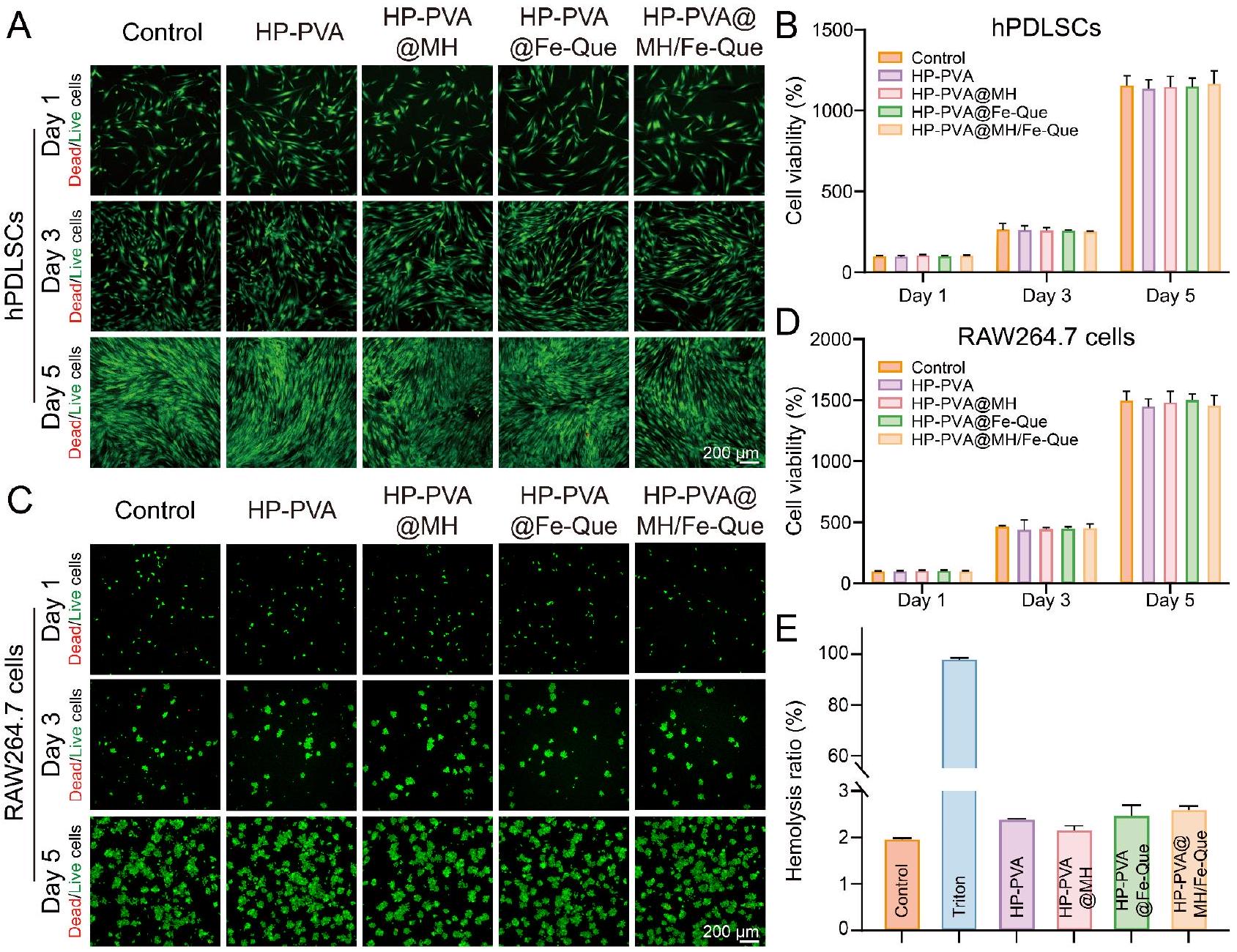 كما هو موضح في الشكل 8A، أظهر هيدروجيل HP-PVA@MH/Fe-Que قدرته على حماية خلايا hPDLSCs من التمايز العظمي. تم تقييم الشكل الخلوي لكل مجموعة هيدروجيل تحت