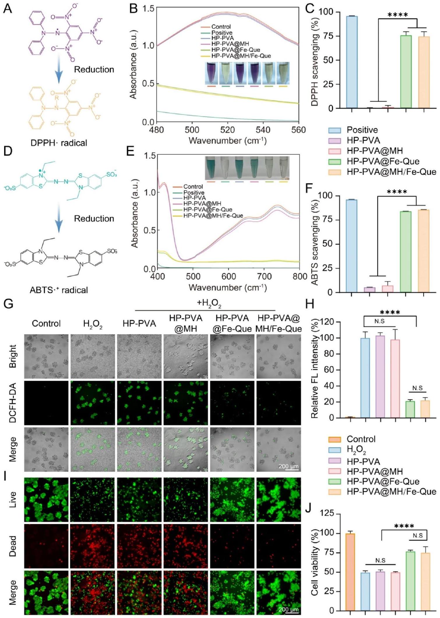 Secondly, ABTS undergoes oxidation, forming a stable green cationic radical with its peak absorption at 405 nm [57]. When the sample is introduced to the ABTS radical solution, the antioxidant compounds interact with the ABTS radicals, resulting in a color change in the reaction system and a reduction in absorbance at 405 nm (Fig. 5D). Besides, the change of its absorbance within a certain range is proportional to the degree of free radicals being scavenged. As Fig. 5E showed, the absorbance of the control group exhibited the highest value and appeared green, while the positive group displayed the lowest absorbance with transparent color. The HPPVA and HP-PVA@MH groups demonstrated negligible capacity for ABTS free radical scavenging. Conversely, the HP-PVA@Fe-Que and HP-PVA@MH/Fe-Que groups displayed a color intermediate between the control and positive groups, exhibiting significantly reduced absorbance levels. The ABTS free radical scavenging rates were consistent as described above (Fig. 5F).