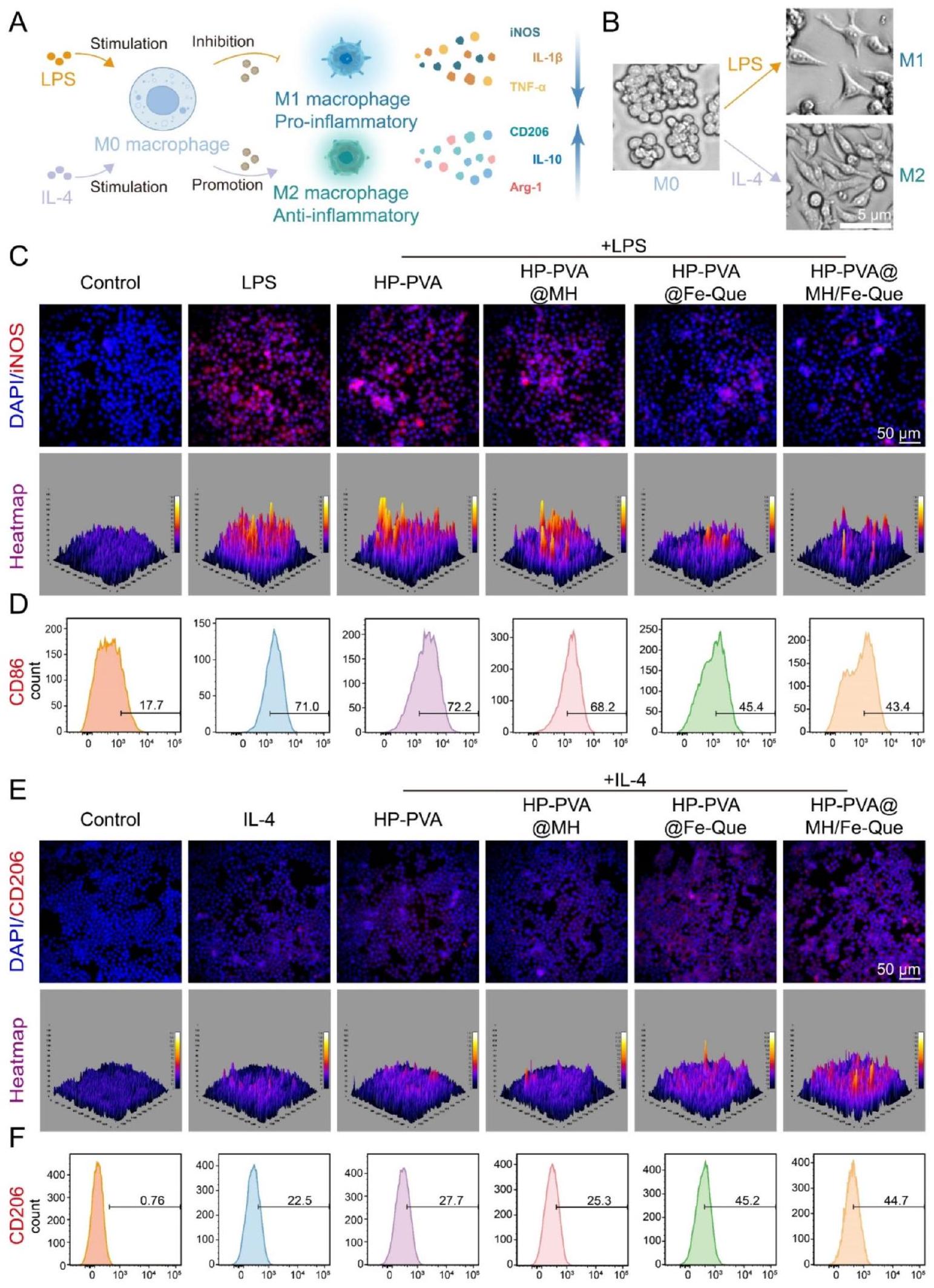 IF staining experiments were initially performed on macrophages to label M1 macrophages expressing inducible nitric oxide synthase (iNOS) and M2 macrophages expressing mannose receptor (CD206). As shown in Fig. 6C, the expression of iNOS in RAW264.7 cells significantly increased after LPS treatment. Compared to the LPS group, no significant difference in iNOS expression was observed in HP-PVA and HP-PVA@MH hydrogels. However, a significant reduction in iNOS expression was observed in the HP-PVA@Fe-Que and HP-PVA@MH/ Fe-Que groups. As shown in Fig. 6E, the expression of CD206 in RAW264.7 cells increased after IL-4 treatment. Similarly, there was no significant variation observed in CD206 expression between the HP-PVA and HP-PVA@ MH hydrogels compared with the IL-4 group; however, a substantial increase was observed in CD206 expression within the HP-PVA@Fe-Que and HP-PVA@MH/ Fe-Que groups. Subsequently, additional flow cytometry analysis was performed to assess macrophage polarization (Fig. 6D, F). The findings demonstrated that the