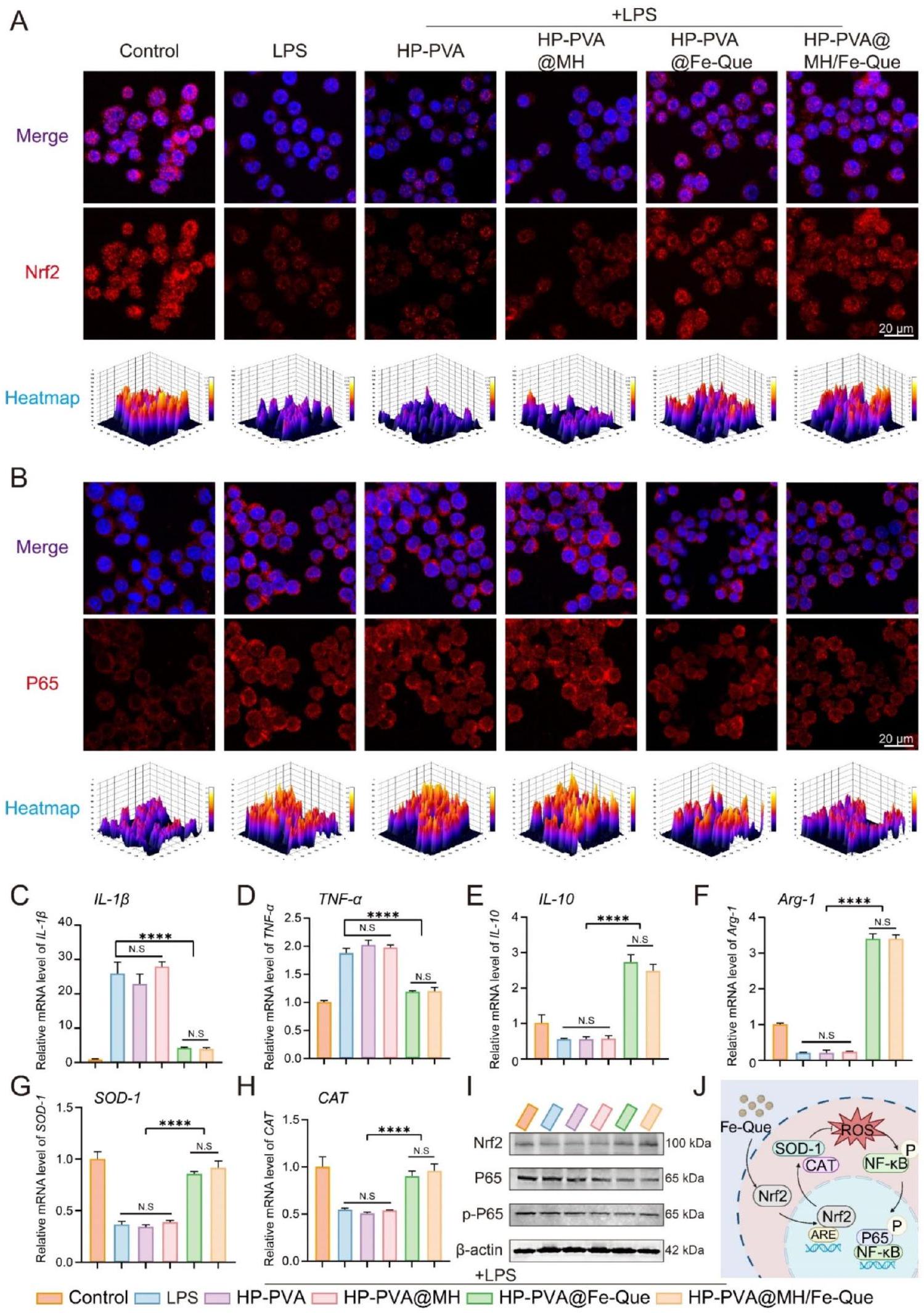 كما هو موضح في الشكل 7A، بعد الالتهاب الناتج عن LPS، أظهرت البلعميات شدة فلورية أقل لنظام Nrf2، كما أظهرت مجموعات HP-PVA و HP-PVA@MH شدة فلورية مشابهة؛ ومع ذلك، كانت إشارة الفلورة لنظام Nrf2 أعلى بشكل ملحوظ في مجموعات HP-PVA@Fe-Que و HP-PVA@MH/Fe-Que مقارنة بمجموعة LPS. على العكس من ذلك، بالنسبة لنظام NF-кB، كانت إشارة الفلورة في مجموعات HP-PVA@Fe-Que و HP-PVA@MH/Fe-Que أقل من مجموعة LPS (الشكل 7B). وفقًا للنتائج الموضحة في الشكل 7C-H، مقارنة بمجموعة LPS، أظهرت مجموعات HP-PVA@Fe-Que و HP-PVA@MH/Fe-Que اتجاهًا هبوطيًا في تعبير السيتوكينات المؤيدة للالتهاب.