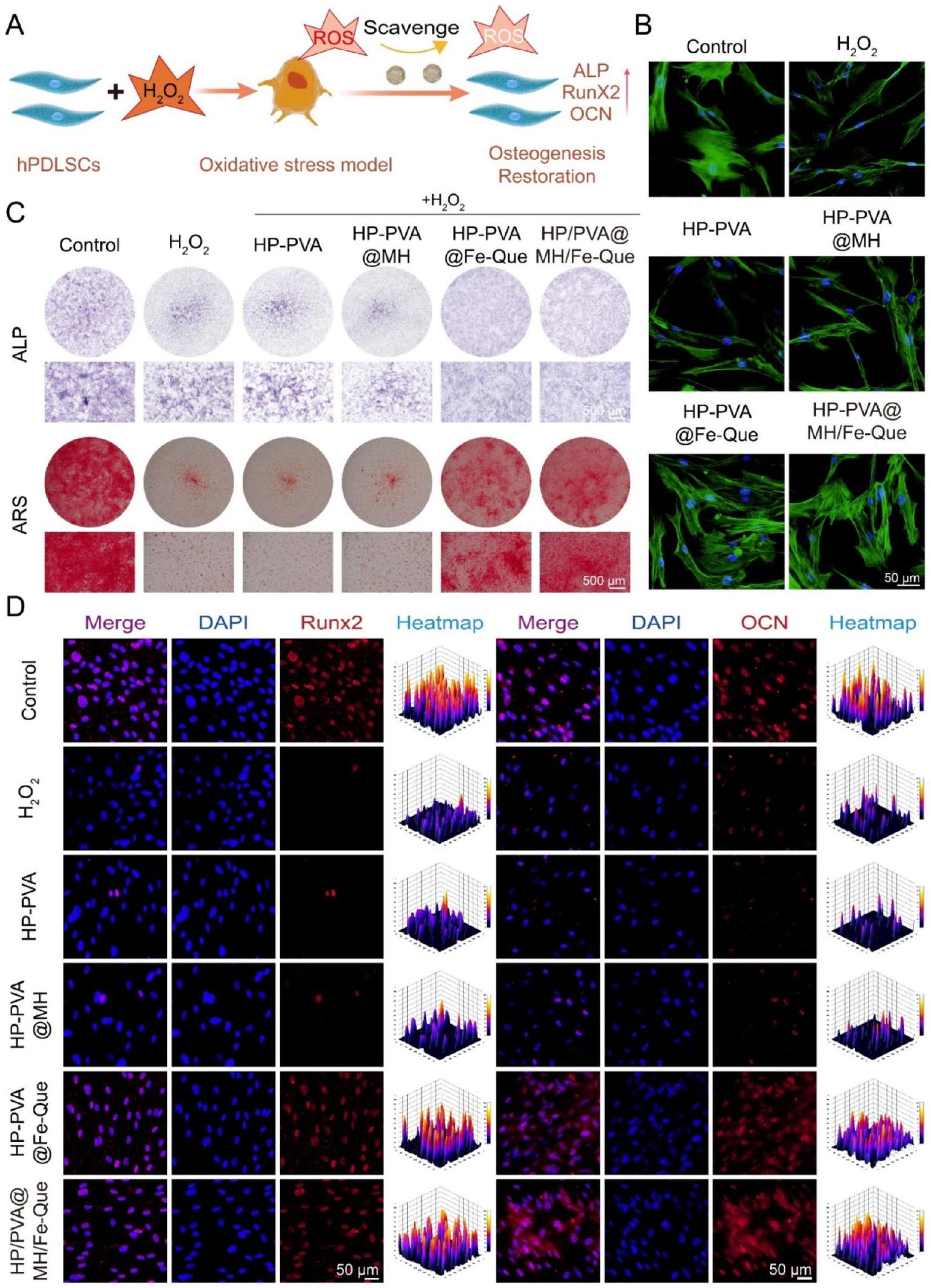As illustrated in Fig. 8A, the HP-PVA@MH/Fe-Que hydrogel demonstrated its ability to protect hPDLSCs from osteogenic differentiation. The cellular morphology of each hydrogel group was evaluated under an